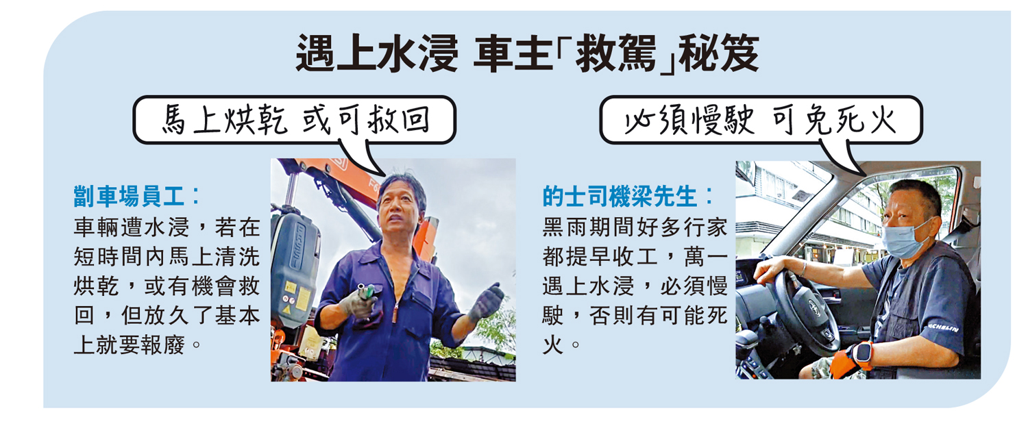 有劏車場老闆表示,近年大熱的充電車是雨災中大輸家,因電子組件特別多,如遇上水浸更慘,根本難以維修,對比普通車輛遇上水浸,短時間內馬上清洗、烘乾或有機會救回,「這幾天收到好多電話問水浸車還能不能用,如報廢能收回多少錢。」該名劏車場老闆還透露,近日回收車輛數量暴增逾倍,有時忙起來根本是應接不暇,需加班處理。