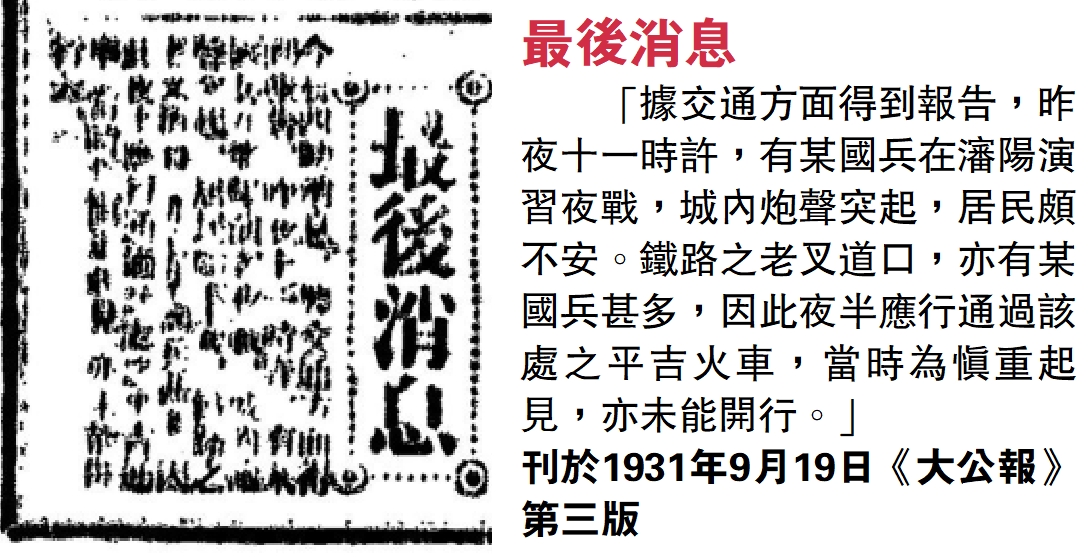 「炎夏剛過,日本軍閥忽製造『九一八』事變,開始對我大規模軍事侵略。」曾任大公報桂林和上海版總編輯的老報人徐鑄成,1931年時正在天津擔任大公報編輯記者,他在回憶錄裏記載下,「九一八」事變發生之次晨,只有大公報在當日要聞版一角,以引起同胞注意的加框之「最後消息」,最先獨家報道「九一八」事變。短短數十字,揭露了日本軍國主義恃強凌弱的侵略暴行。