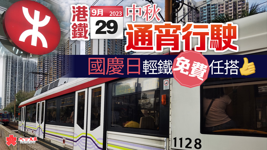 大公文匯全媒體報道,中秋及國慶節日將至,港鐵今日(19日)公布相應安排。港鐵表示,下周五(9月29日)中秋節當晚,列車將通宵行駛;中秋及國慶長周末,即9月29日至10月2日,港鐵將加強列車服務,額外增加近900班車。至於國慶日,輕鐵及行走新界西北路綫的港鐵巴士全日將提供免費服務。
