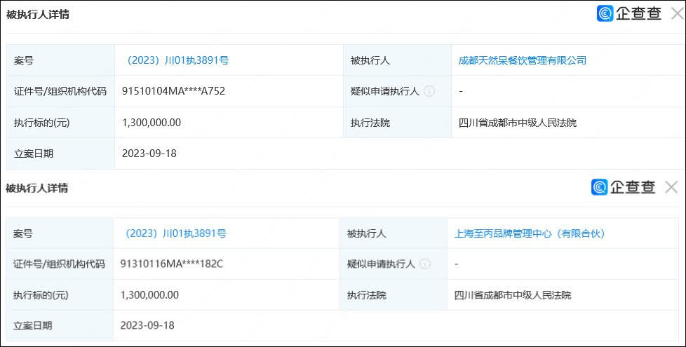 企查查APP顯示,近日,成都天然呆餐飲管理有限公司、上海至丙品牌管理中心(有限合夥)新增一則被執行人信息,執行標的130萬元,執行法院為四川省成都市中級人民法院。此前,上述被執行人曾多次因特許經營合同糾紛被起訴。