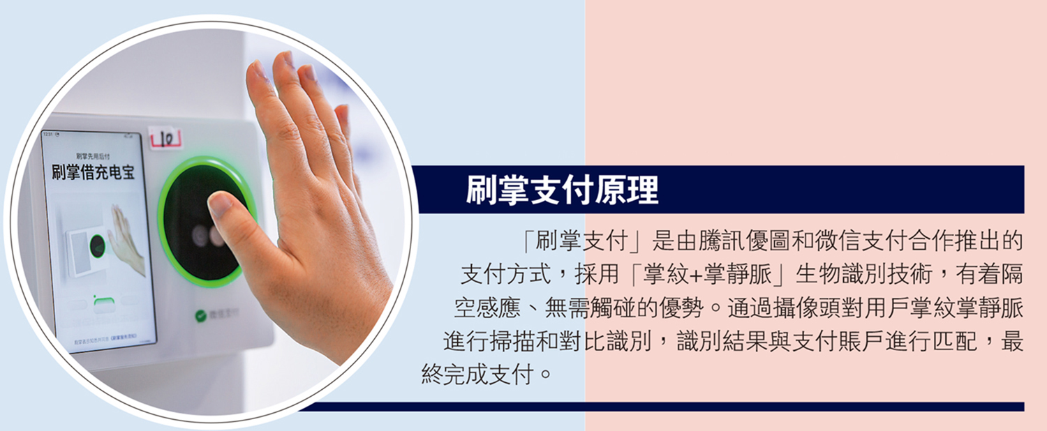 •刷掌符合高頻支付的高安全度要求,因刷掌支付是讀取掌心血管紋路,不用接觸屏幕感應器,也沒有被竊取二維碼風險,衞生及安全度較指紋或掃碼高。