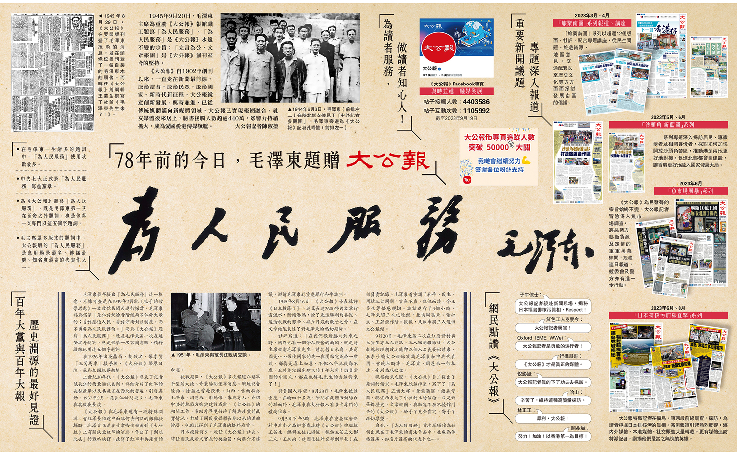 晚宴結束之際,《大公報》員工提出了題詞的請求。毛澤東欣然揮毫,寫下了「為人民服務」五個大字。筆意瀟灑,語義雙關,既宣示表達了中共的立場信念,又是對筆錄歷史、文章報國、與敵寇不屈不撓作鬥爭的《大公報》,給予了充分肯定、寄予了深切厚望。