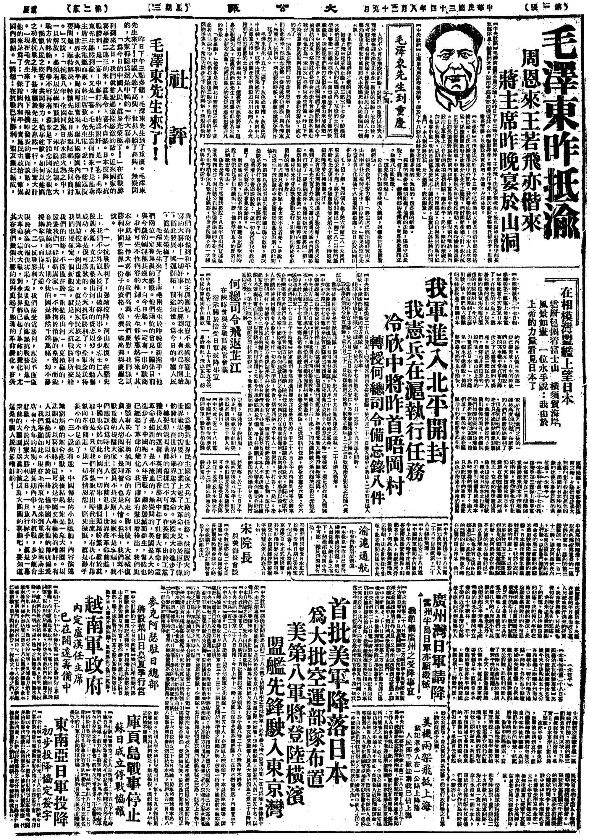 1945年8月16日,《大公報》發表社評《日本投降了》。這篇長達2600字的文章行雲流水,酣暢淋漓,除了表達勝利的喜悅、追念抗戰的艱辛、痛斥日寇的敗亡之外,在文章結尾表達了對毛澤東的熱切期盼。