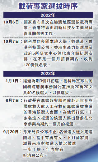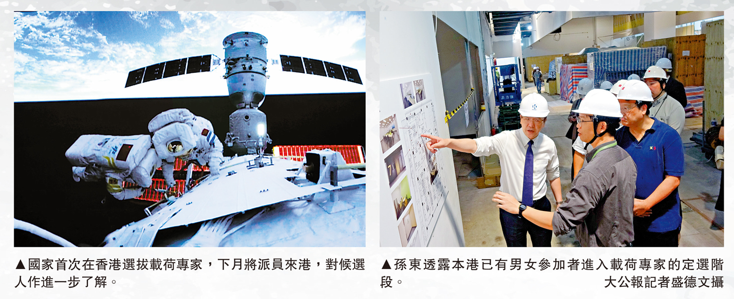 創新科技及工業局局長孫東,昨日在將軍澳香港科學園區先進製造中心出席衛星下線儀式時透露,目前本港已有男女參加者進入載荷專家的「定選」階段,國家下月將派員來港,對候選人作進一步了解。