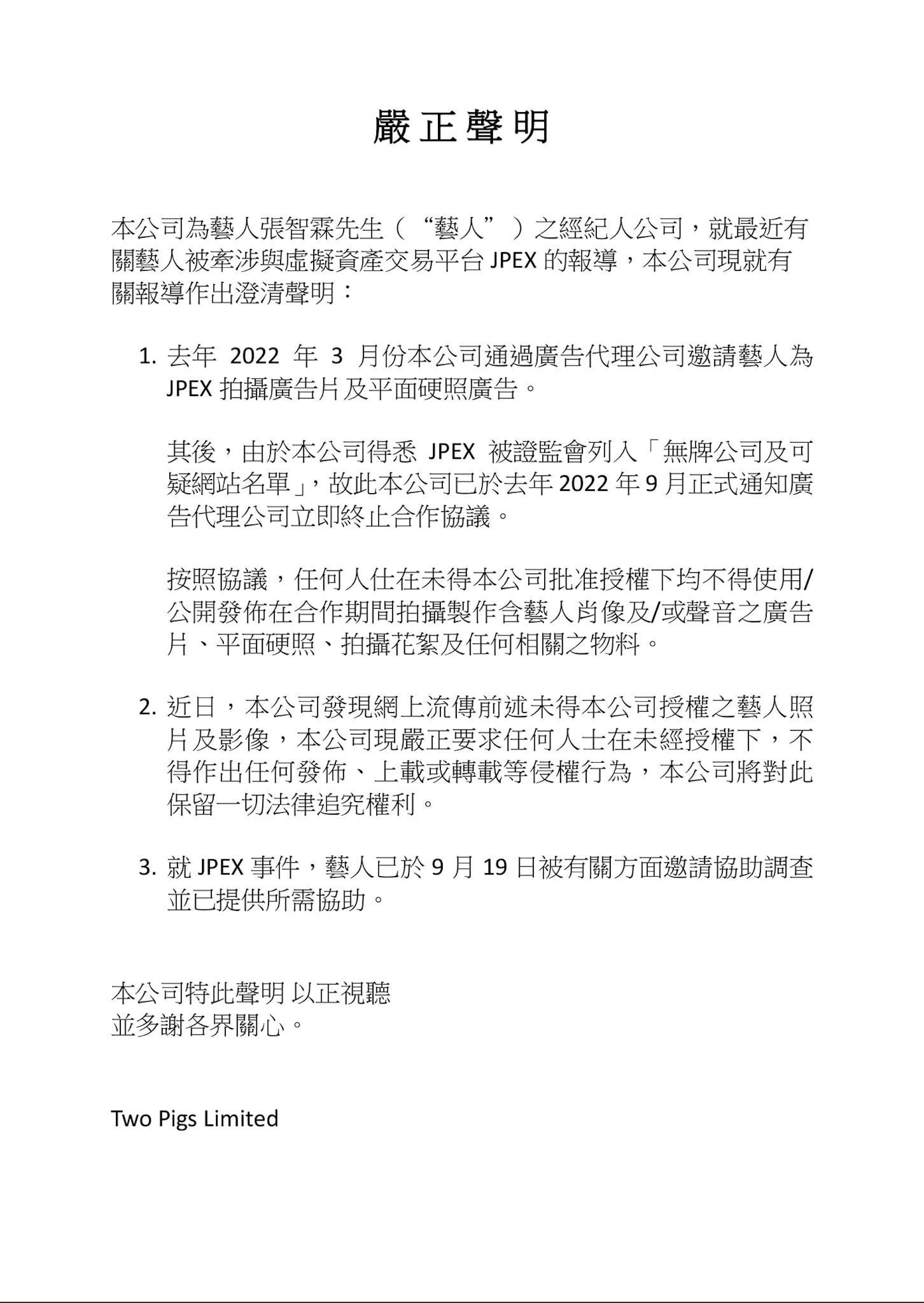 今晚9時多,張智霖所屬的經理人公司就有關事件發出嚴正聲明,指2022年3月份公司通過廣告代理公司邀請藝人為JPEX拍攝廣告片及平面硬照廣告。其後,由於公司得悉JPEX被證監會列入「無牌公司及可疑網站名單」,故此已於2022年9月正式通知廣告代理公司立即終止合作協議。按照協議,任何人士在未得公司批准授權下均不得使用/公開發布在合作期間拍攝製作含藝人肖像及/或聲音之廣告片、平面硬照、拍攝花絮及任何相關之物料。