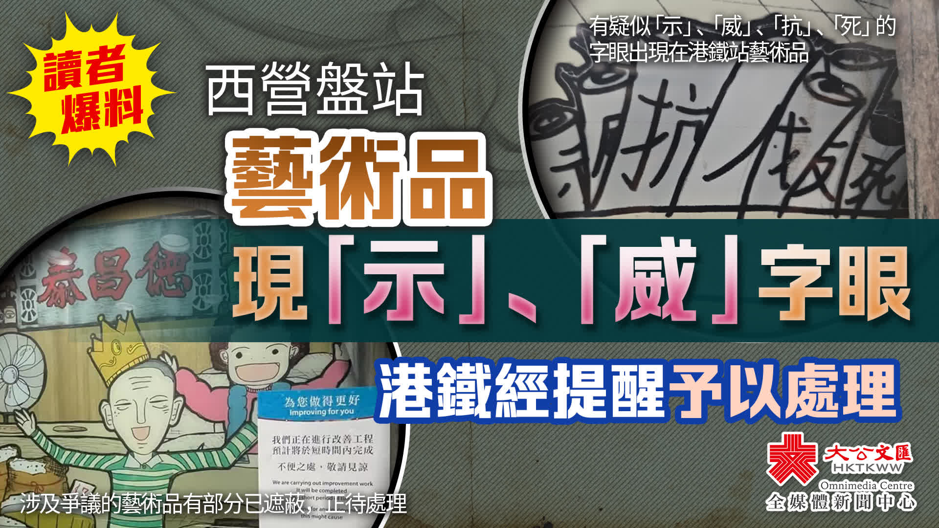 (大公文匯全媒體 記者 王哲)有大公文匯全媒體讀者爆料,港鐵西營盤站有藝術作品,疑似「示威」「抗爭」訊息,擔心港鐵被利用為「軟對抗」平台,希望喚起相關企業以至社會大眾的關注。