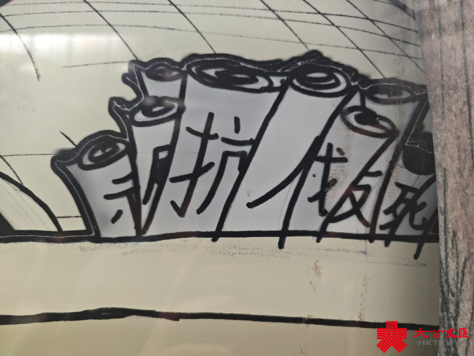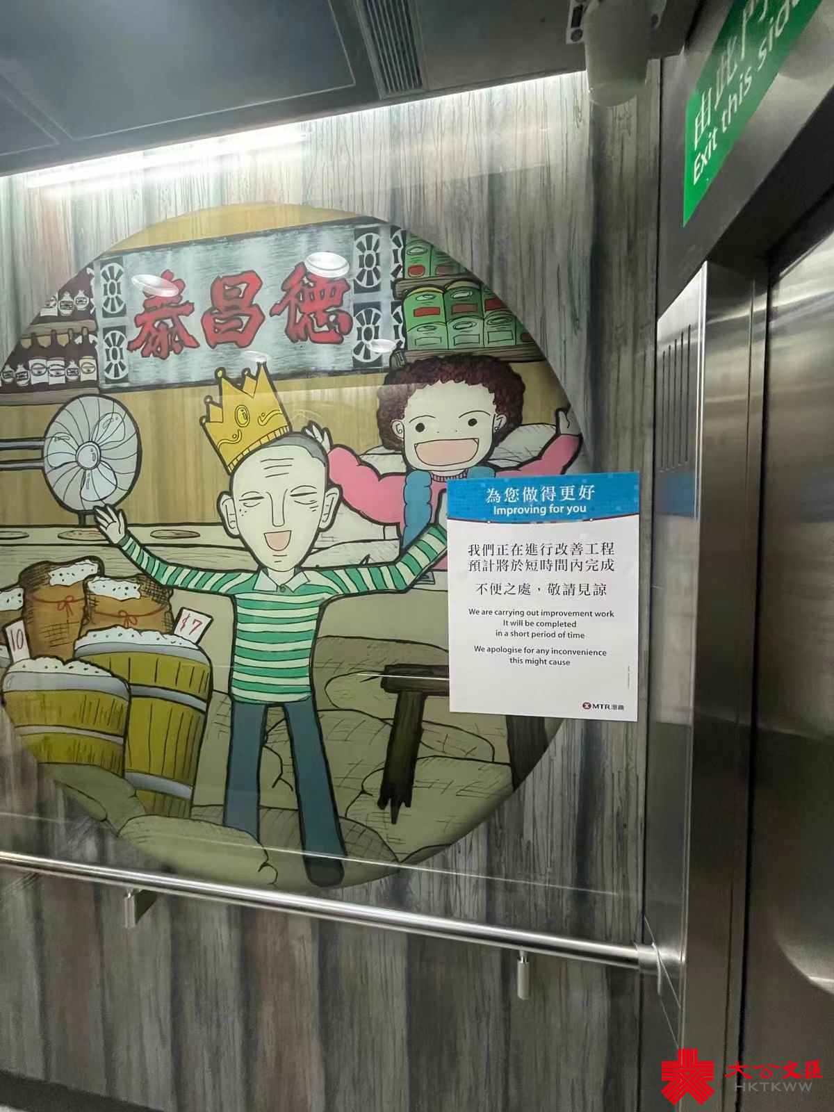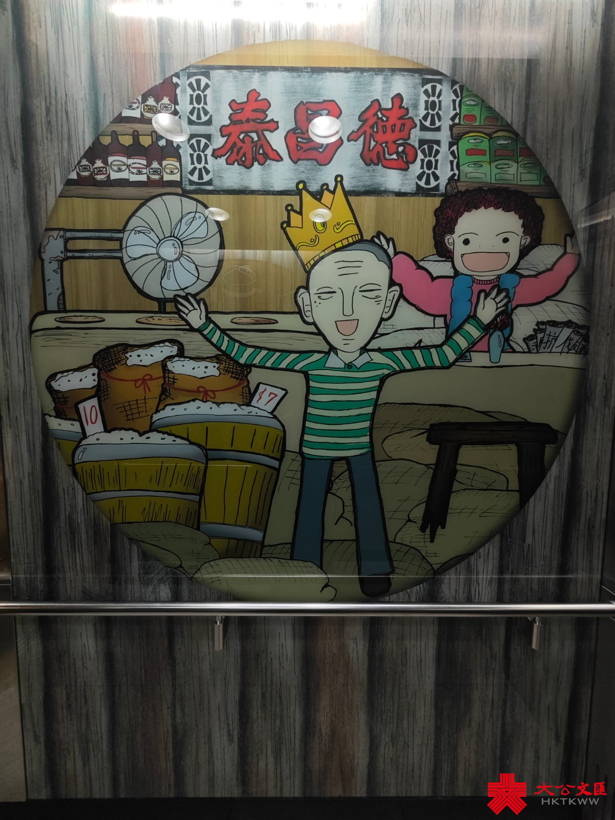 大公文匯全媒體記者早前到訪西營盤港鐵站B出口,如讀者描述,LT-06升降機內有一幅藝術作品,描繪傳統米舖泰昌德的店面。畫中老人頭戴皇冠,身穿白綠間條上衣,右側放有一堆報紙,上面印有疑似「示」「威」「抗」「死」的字眼。其後,記者走訪其他升降機(LT-03至LT-05),未有從作品中發現涉及「抗爭」或「示威」的字句。