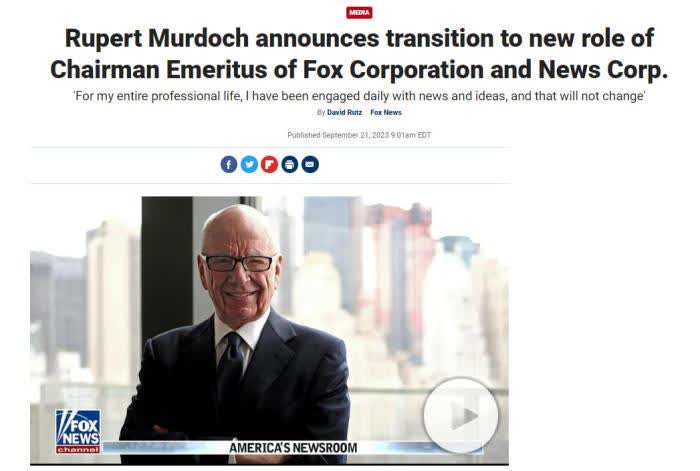 據報道,魯伯特·默多克致信員工稱:「我寫這封信是想讓大家知道,我已經決定過渡到福克斯和新聞集團名譽主席的角色。」
