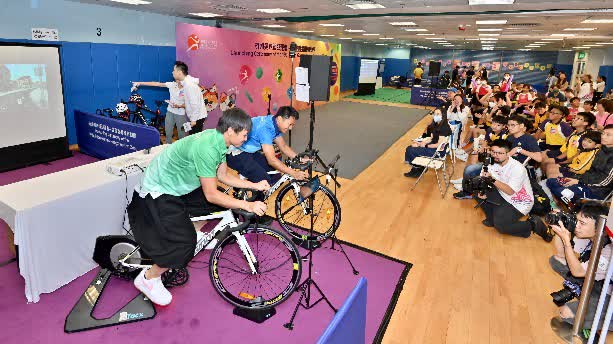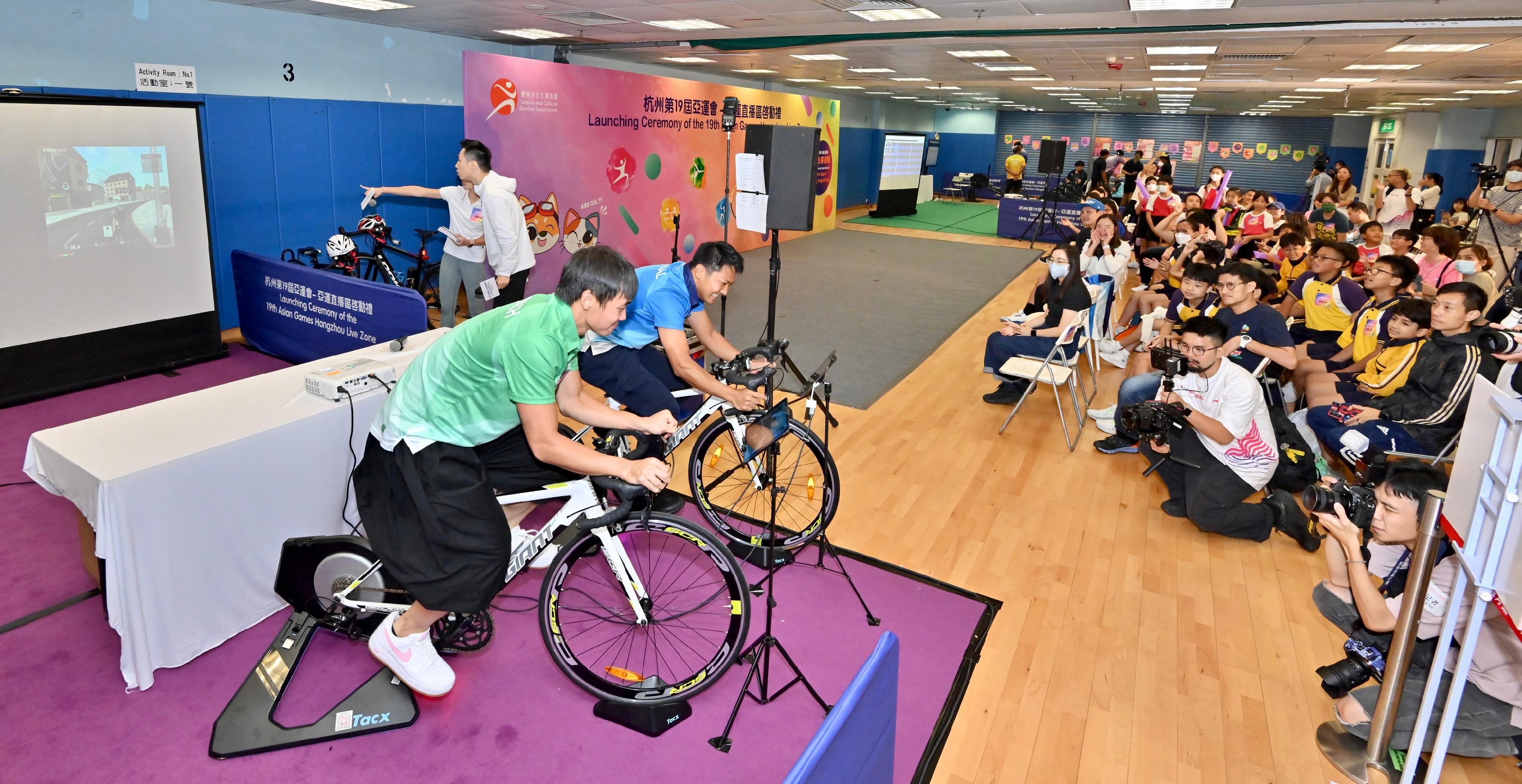 出席啟動禮的嘉賓在活動中觀賞單車和賽艇運動示範,並透過互動遊戲為香港運動員打氣。