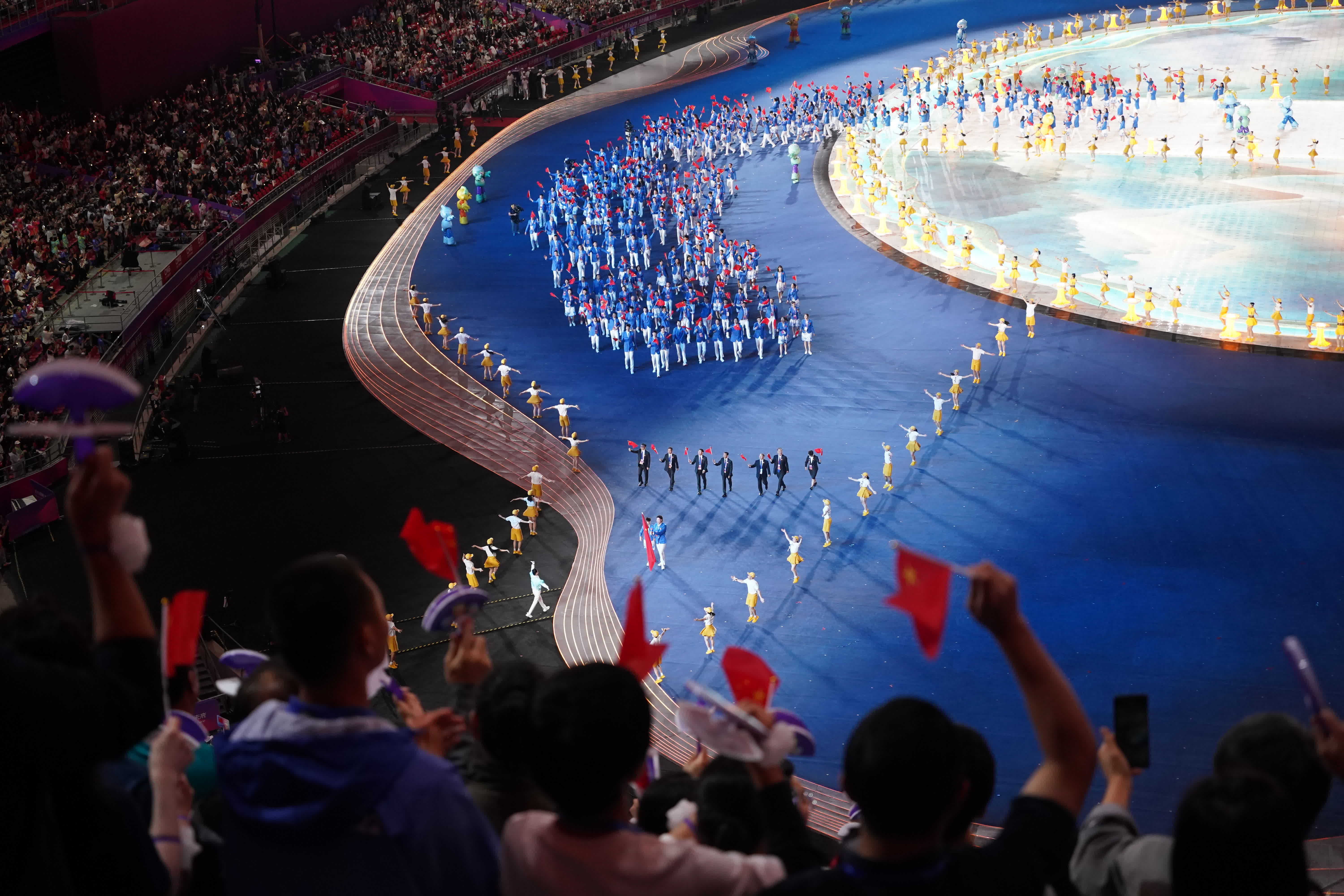 文藝表演《潮起亞細亞》拉開帷幕,表演分為上中下三部分。上篇《國風雅韻》中,國風少年以地為畫、踏墨而舞,宋韻女子亭亭玉立、翩然靈動,遊船往來、燈影點點,全景立體影像構築的拱宸橋躍然於大運河之上,展現錢塘繁華和江南風韻的雋永景象。中篇《錢塘潮湧》中,飛旋於空中的演員與潮共舞,「弄潮兒」乘着風帆匯入潮流,吉祥物「江南憶」破水而出、騰躍跳動,激發起活力澎湃的運動浪潮。下篇《攜手同行》中,「白鷺精靈」遨遊星海之中,隨着悠揚的歌聲和清麗的越劇唱腔,數百名大學生手持發光金桂點亮綿延悠長的「金桂之江」,亞洲各個國家和地區的地標性建築共同呈現,構成各美其美、美美與共的亞洲畫卷。精彩紛呈的表演,深深打動了現場觀眾。