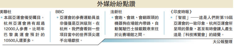 大公報綜合BBC、美聯社、法新社報道:杭州亞運會23日正式開幕,來自45個國家和地區的12000多名運動員將展開激烈角逐。國際社會早早就將目光投向了杭州,外媒以「歷史文化與世界頂尖科技交融的盛會」來形容本次亞運。BBC稱,為期15天的賽事不僅是亞洲體育文化的一次盛會,也是中國向外界展現東道主面貌的機會。《印度時報》稱,杭州亞運會所呈現的景象,會讓人彷彿置身於「科技博覽會」。