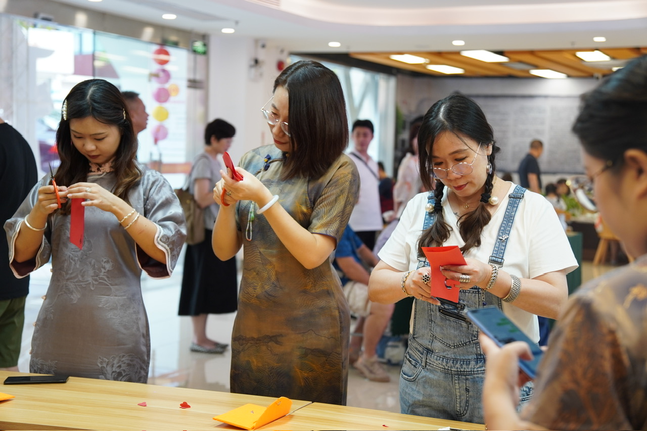 現場教學的剪紙老師被團團圍住,在其指導下,港澳青年們製作出一份份精美的剪紙作品,拿着自己製作的非遺作品,格外開心。