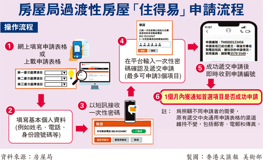 她又指,局方今日將推出電子平台「住得易」,居民可透過手機或電腦查詢申請資料及登記項目,令申請過程更有效及迅速,讓有需要人士和家庭可以早日改善居住環境。「住得易」平台操作簡單,申請者只需按指示輸入所需基本資料和選擇希望入住項目,便能在短時間內完成申請,且網上遞交申請後會即時收到確認短訊,當中附有申請編號供日後查詢申請進度和結果。該平台未來亦會陸續加入數據收集、統計和分析等功能。為照顧不同申請者需要,原有遞交中央通用申請表格的渠道維持不變,包括郵寄、電郵和傳真。