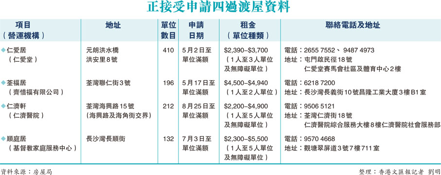 房屋局昨日在旺角社區會堂舉辦第二場的過渡性房屋開放日,多個營運過渡性房屋項目的機構參與,為市民介紹該些項目的居住環境、交通配套,以及生活設施等,並可即場接受有需要人士即場遞交申請,更提供專車往返4個正接受申請的過渡性房屋項目,包括元朗的「仁愛居」、荃灣的「荃福居」與「仁濟軒」,以及長沙灣的「順庭居」,4個項目合供提供950個單位(見表),有超過180人乘坐專車到上述項目參觀。