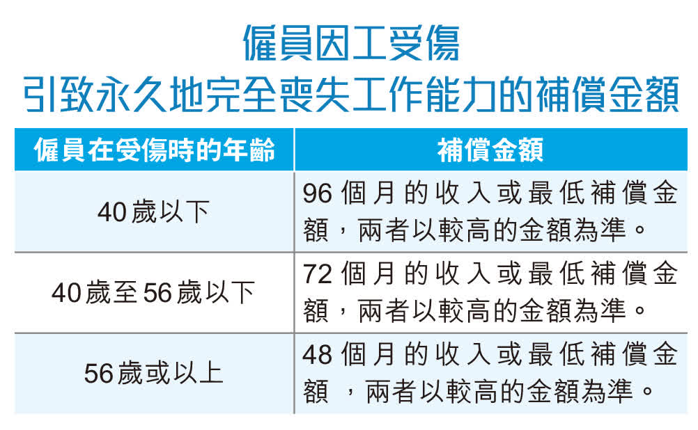 若僱員因工受傷引致永久地部分喪失工作能力,補償金額須視乎僱員喪失賺取收入能力的程度,並參照永久地完全喪失工作能力的補償金額,按比例計算: