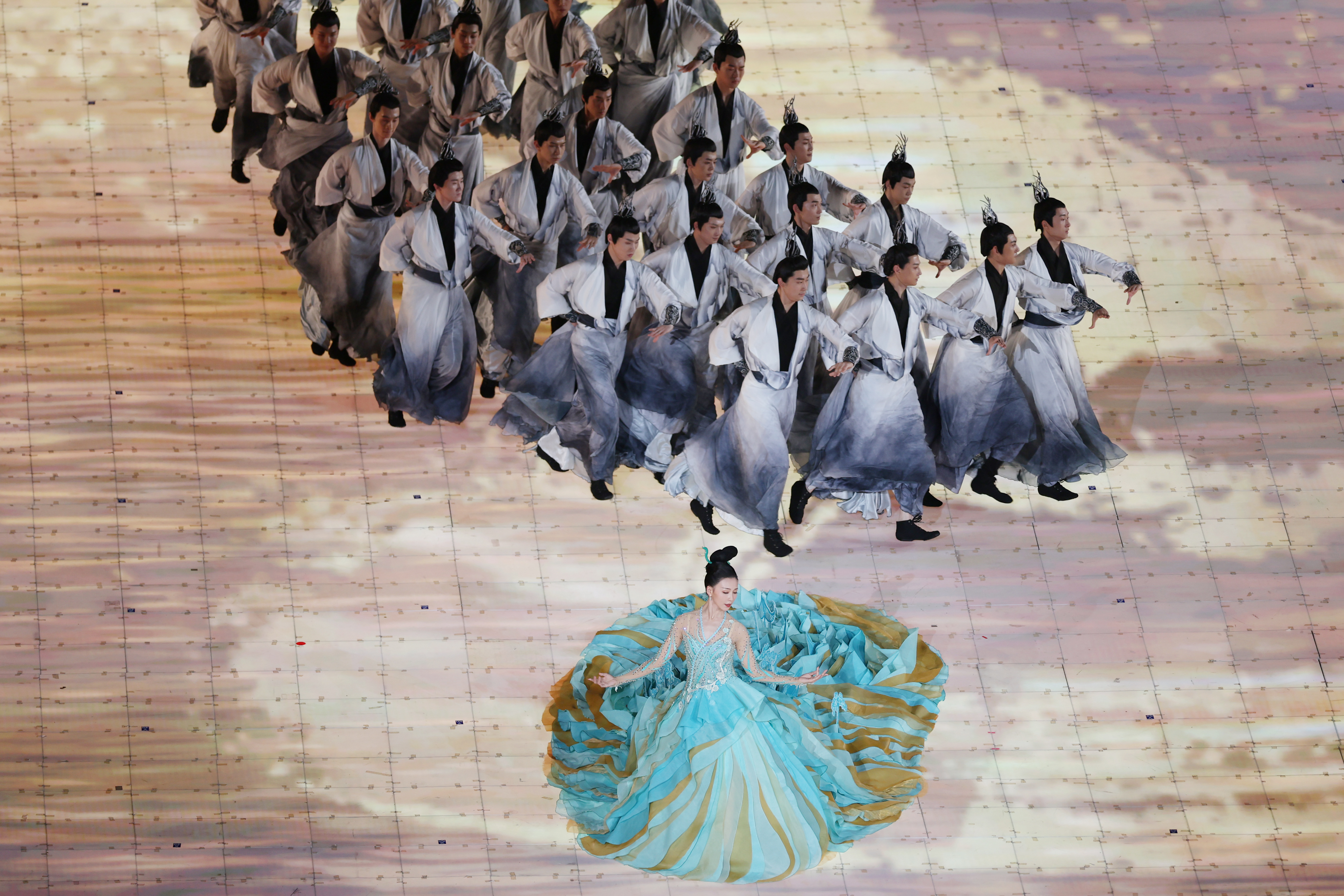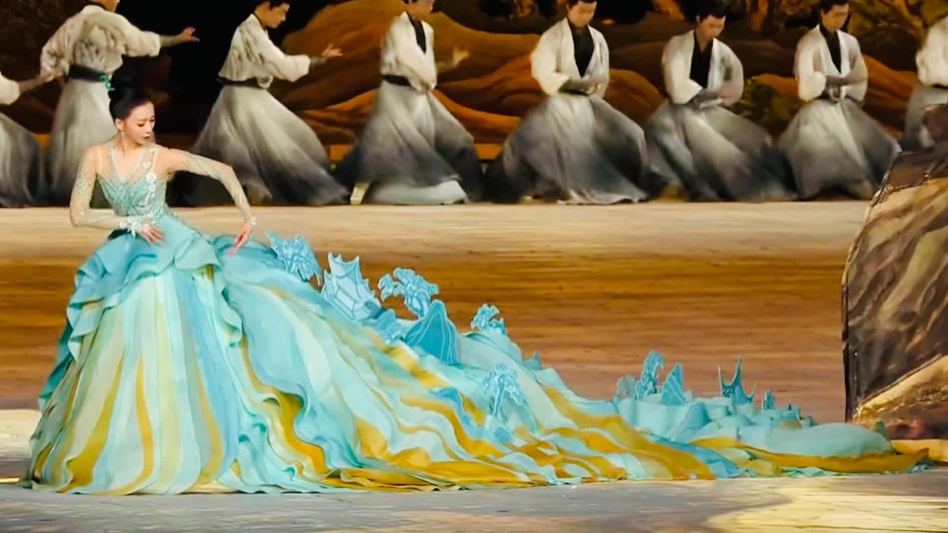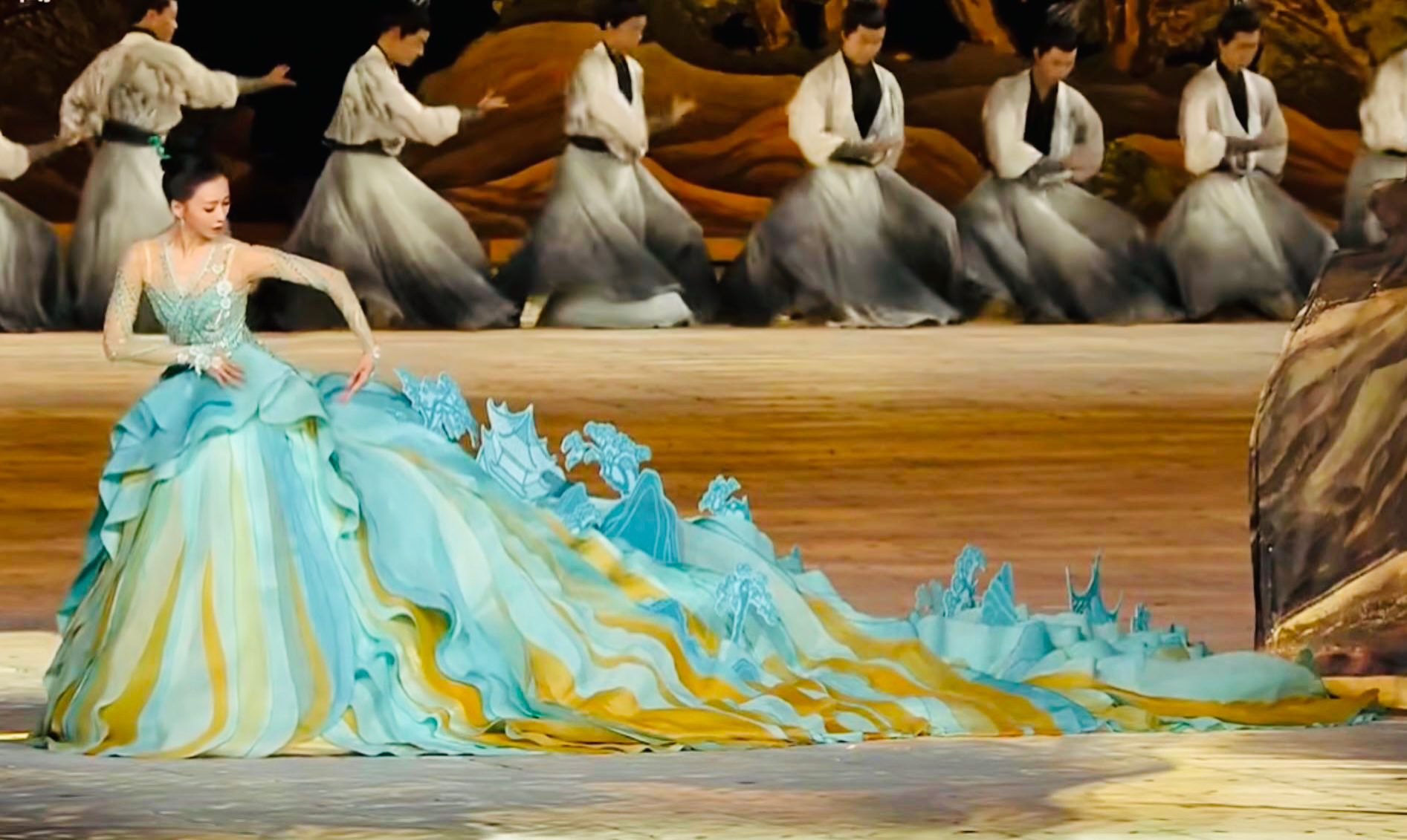 開篇「水墨入詩畫」,高科技地屏和3D裸眼技術讓觀眾鳥瞰祖國的壯美山河,彷彿身臨其境,醉入其中。領舞演員身着「水天碧」長裙,幻化出溫潤如玉的形象,在青綠交輝的山水間翩翩起舞;身着水墨袍服的少年伴舞相和,英姿勃發,身形瀟洒,掀起了開幕式表演的一段高潮。