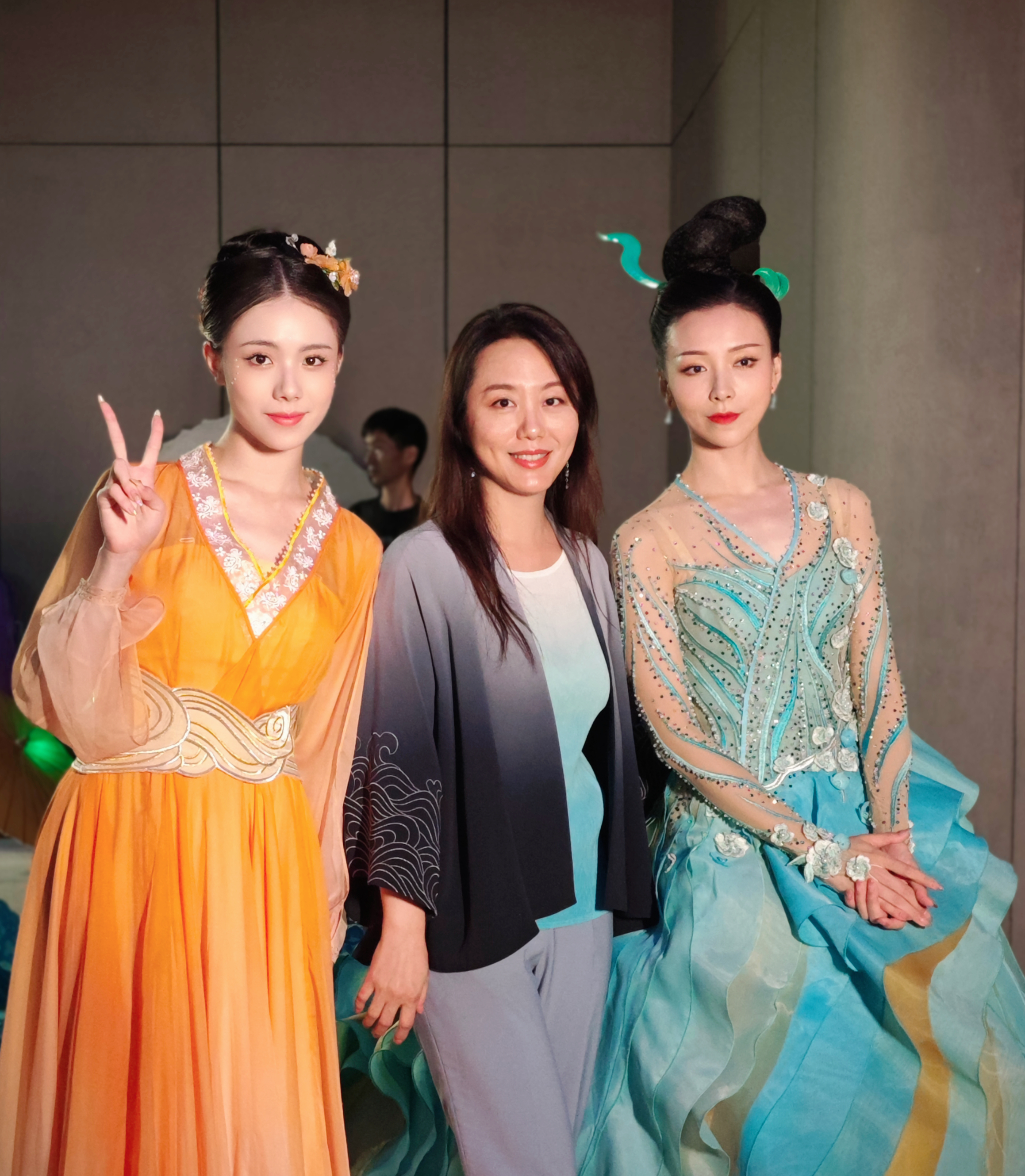 在進行「國風雅韻」的服裝設計期間,她重新細細觀覽研讀了「中國歷代繪畫大系」中的《宋畫全集》,去體味宋代的色彩、風雅與韻味。從靈感來源、人物造型、色彩、紋樣到美學生活方式的表達等方面,很多來自於對「大系」中的宋畫作品的挖掘,從中汲取宋韻文化美學元素,並融入杭州西湖十景等典型的浙江地域符號與意象,進行傳承和創新設計。