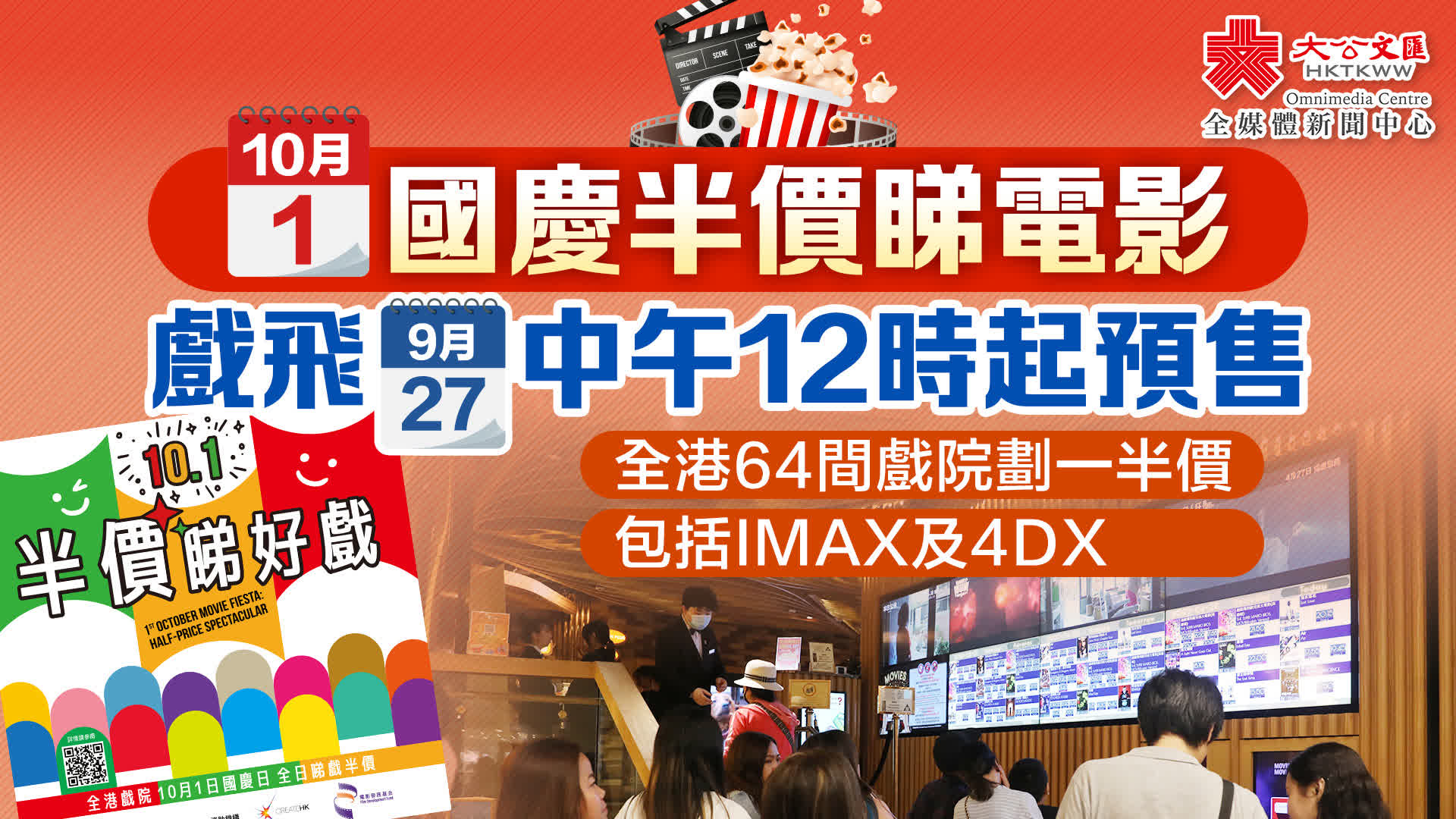 香港戲院商會指,10月1日當天,全港64間戲院全日任何放映場次,任何放映格式,劃一提供半價優惠。同時,一般戲院常設的長者首場優惠、小童、學生、長者票價均提供半價優惠,即當日除包場及特備節目以外,所有票種均提供半價,而所有換票證、電影贈券、會員優惠及銀行優惠當日不適用。