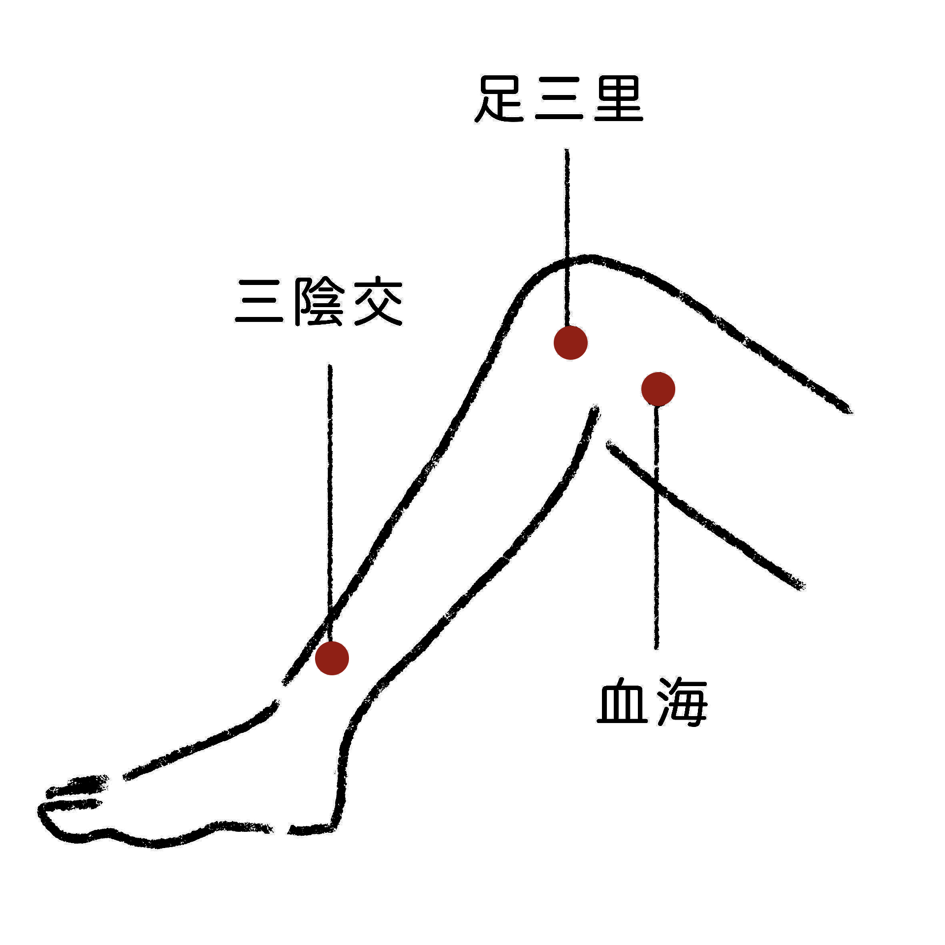 血海、三陰交均為足太陰經穴,三陰交又是足三陰經交會穴,兩穴有調理沖任、血海之功,可健脾補肝腎。
