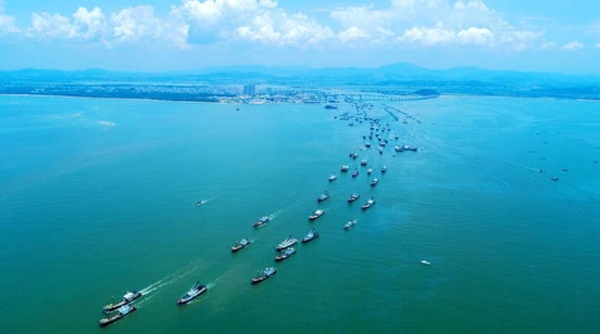 深藍色的海水捲起層層浪,奔騰、拍打在長長的鋼筋水泥堤壩上,濺起白色的浪花。在博賀港新港,數十萬噸的巨輪正停靠補給,巨大的紅色門機忙碌不歇,百千集裝箱分發流轉,運送車輛往來不停。隨着汽笛一聲長鳴,新的巨輪正劈開波瀾,駛往海洋。
