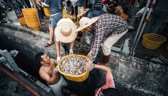 一聲汽笛劃破夜幕,深黑色的海面上隨着燈塔照射盪起了金色的波紋,遠處一艘暈着橘黃色光的船出現在天際線上。緊接着,越來越多的汽笛聲響起,星星點點的漁火綻放在海平面上,幾百艘形式各樣的漁船滿載着魚蝦螺蟹正在回港。岸上燈火通明,魚販在白熾燈下將魚筐陳列,擺放着攤位;貨車一輛輛排隊等待着漁船靠岸,運送海鮮到餐桌……