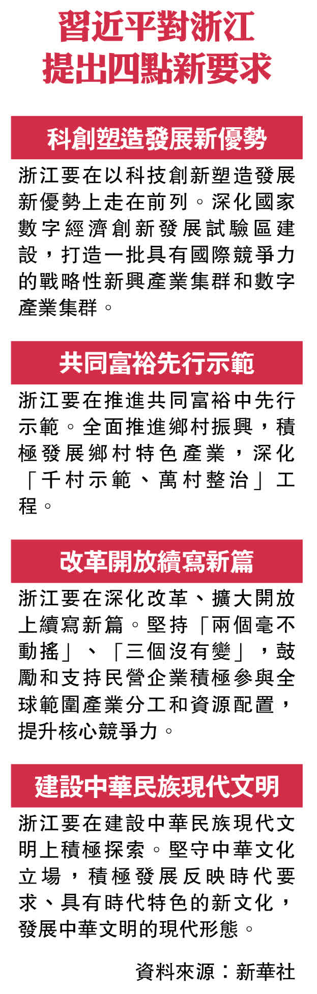 大公報援引新華社報道,中共中央總書記、國家主席、中央軍委主席習近平近日在浙江考察時強調,要完整準確全面貫徹新發展理念,圍繞構建新發展格局、推動高質量發展,聚焦建設共同富裕示範區、打造新時代全面展示中國特色社會主義制度優越性的重要窗口,堅持一張藍圖繪到底,持續推動「八八戰略」走深走實,始終幹在實處、走在前列、勇立潮頭,奮力譜寫中國式現代化浙江新篇章。習近平對浙江提出了新要求,他指出,浙江要在推進共同富裕中先行示範。運用杭州亞運會亞殘運會、世界互聯網大會等窗口加強文化交流傳播,不斷提升中國文化感染力和中華文明影響力。