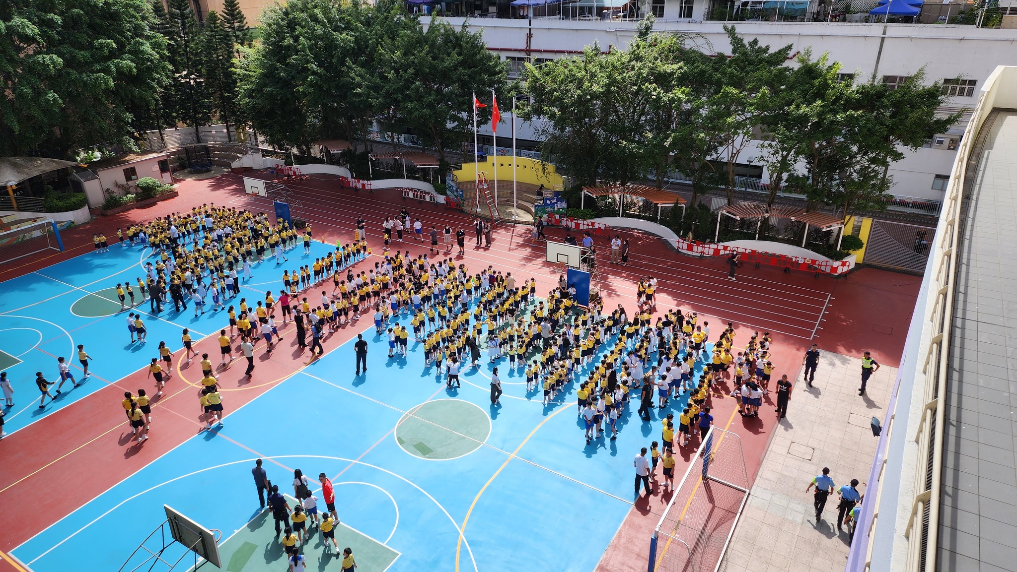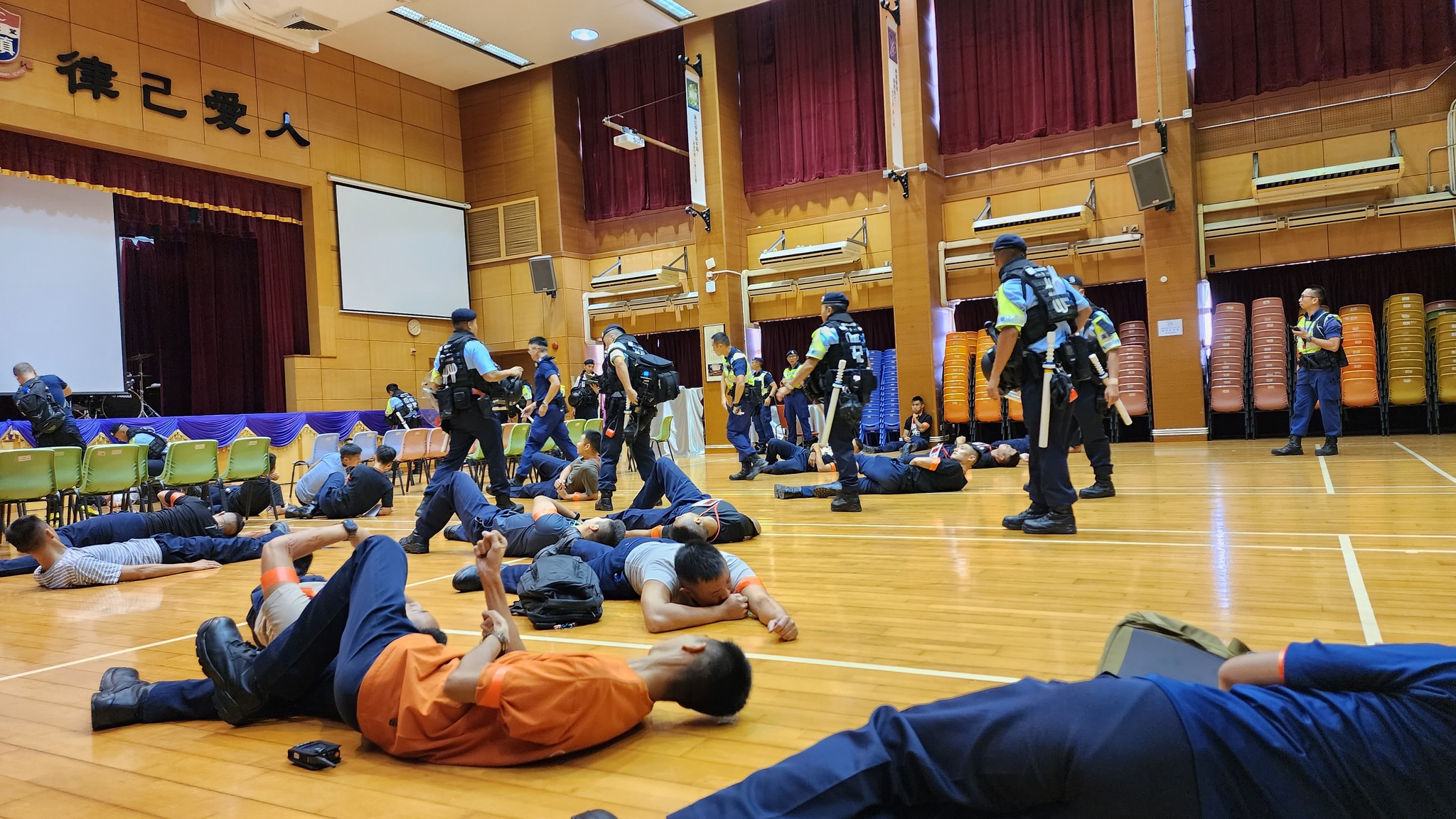 大公文匯全媒體報道,警方今日(26日)進行校園反恐演習,模擬有數人闖入校園,並持刀於校內進行襲擊及縱火,機動部隊人員迅速抵達現場,成功制服所有疑犯,並安全有序地疏散全校師生。