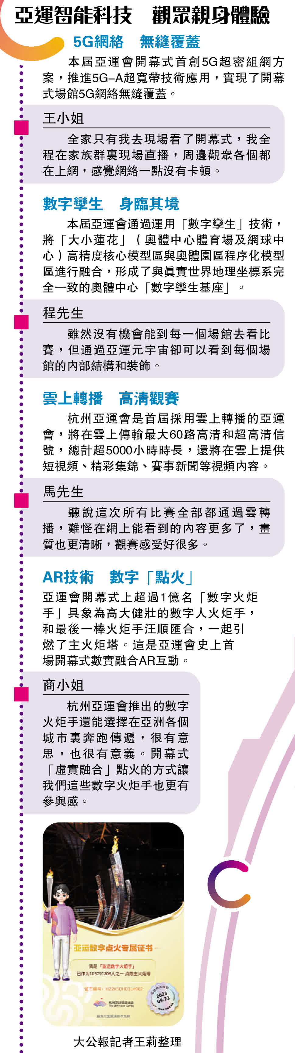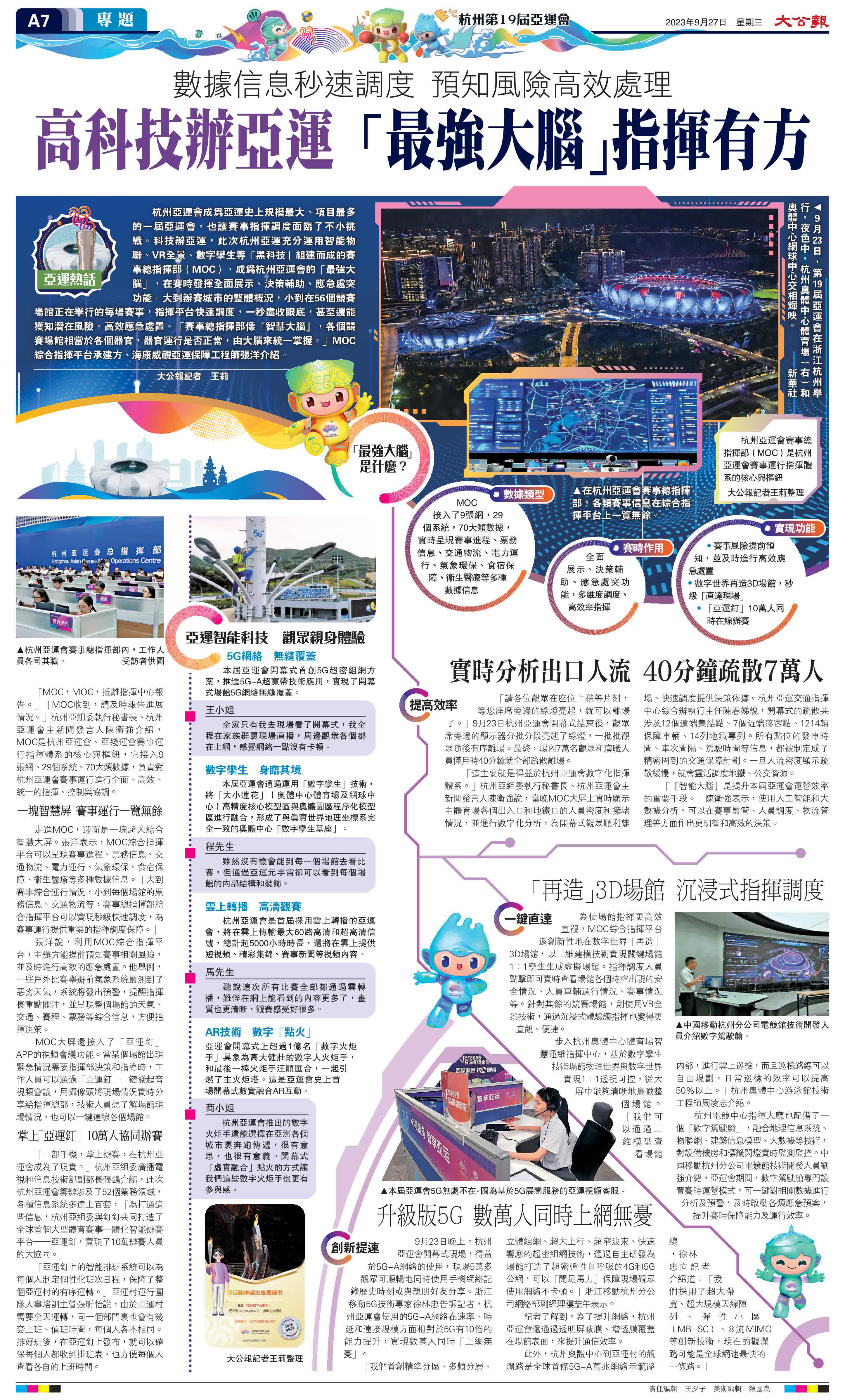 (大公報 記者 王莉)杭州亞運會成為亞運史上規模最大、項目最多的一屆亞運會,也讓賽事指揮調度面臨了不小挑戰。科技辦亞運,此次杭州亞運充分運用智能物聯、VR全景、數字孿生等「黑科技」組建而成的賽事總指揮部(MOC),成為杭州亞運會的「最強大腦」,在賽時發揮全面展示、決策輔助、應急處突功能。大到辦賽城市的整體概況,小到在56個競賽場館正在舉行的每場賽事,指揮平台快速調度,一秒盡收眼底,甚至還能獲知潛在風險、高效應急處置。「賽事總指揮部像『智慧大腦』,各個競賽場館相當於各個器官,器官運行是否正常,由大腦來統一掌握。」MOC綜合指揮平台承建方、海康威視亞運保障工程師張洋介紹。