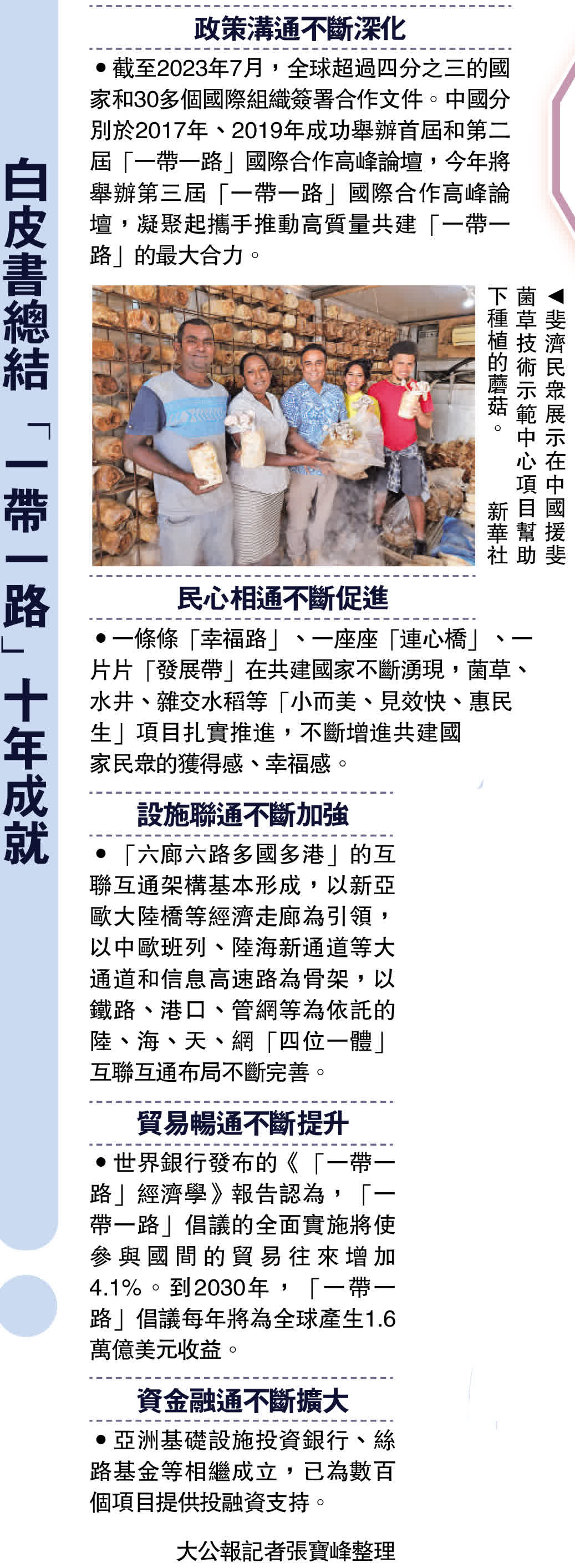 白皮書還提到,國際社會高度評價這一倡議,認為「一帶一路」不是簡單一條路或一條經濟帶,而是讓全人類共同進步的倡議,為各國共同發展開闢了新道路。「一帶一路」倡議助推發展中國家現代化的進程,促進跨大洲協力合作進入新時代。