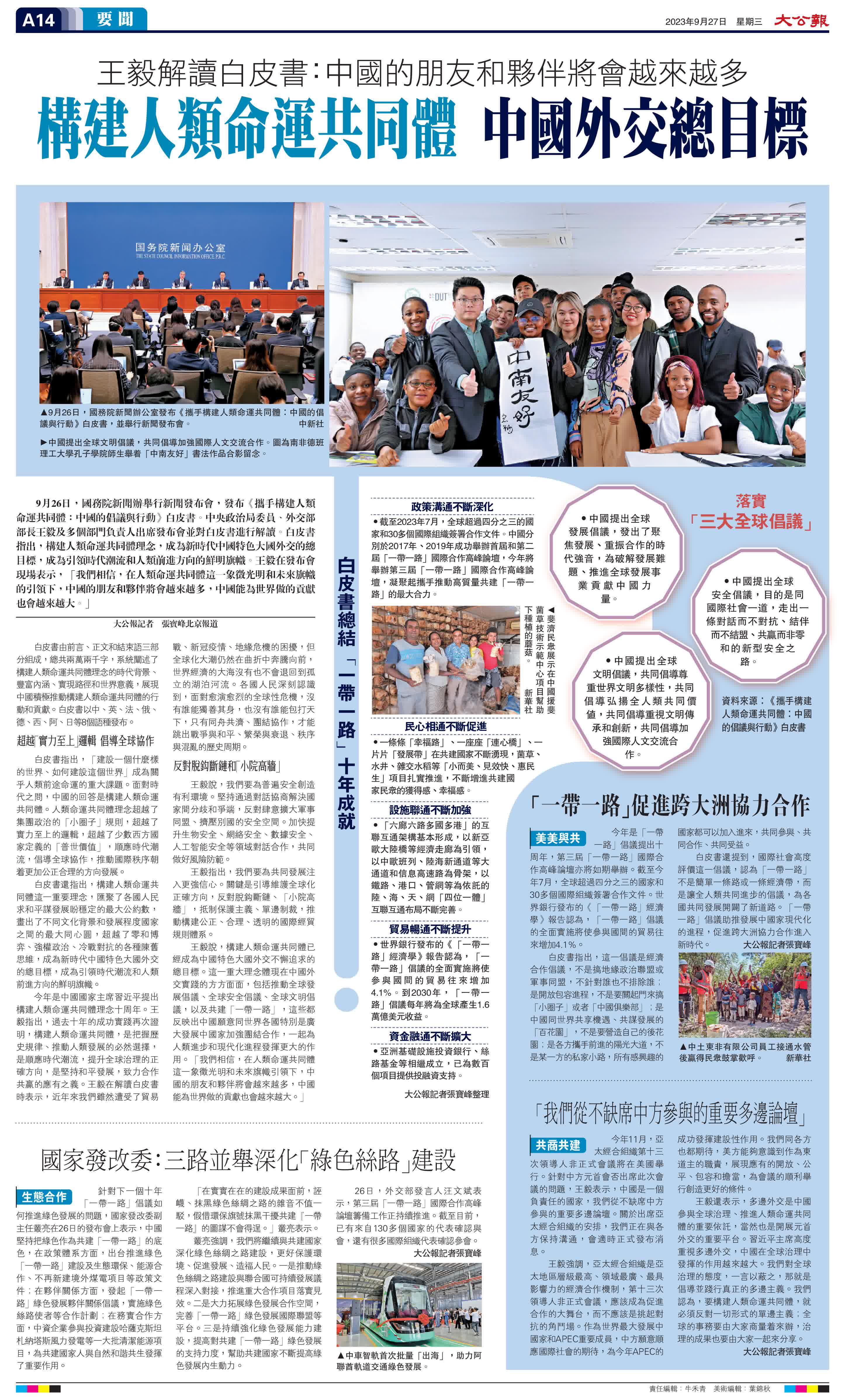 今年是中國國家主席習近平提出構建人類命運共同體理念十周年。王毅指出,過去十年的成功實踐再次證明,構建人類命運共同體,是把握歷史規律、推動人類發展的必然選擇,是順應時代潮流,提升全球治理的正確方向,是堅持和平發展,致力合作共贏的應有之義。王毅在解讀白皮書時表示,近年來我們雖然遭受了貿易戰、新冠疫情、地緣危機的困擾,但全球化大潮仍然在曲折中奔騰向前,世界經濟的大海沒有也不會退回到孤立的湖泊河流。各國人民深刻認識到,面對愈演愈烈的全球性危機,沒有誰能獨善其身,也沒有誰能包打天下,只有同舟共濟、團結協作,才能跳出戰爭與和平、繁榮與衰退、秩序與混亂的歷史周期。