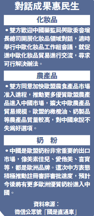 雙方同意建立出口管制領域對話機制,就出口管制政策和實踐,開展溝通對話。雙方還在加強知識產權領域對話合作、促進中歐化妝品貿易、加快歐盟農食產品市場准入進程、加強綠色金融和可持續金融合作等方面展開研討。