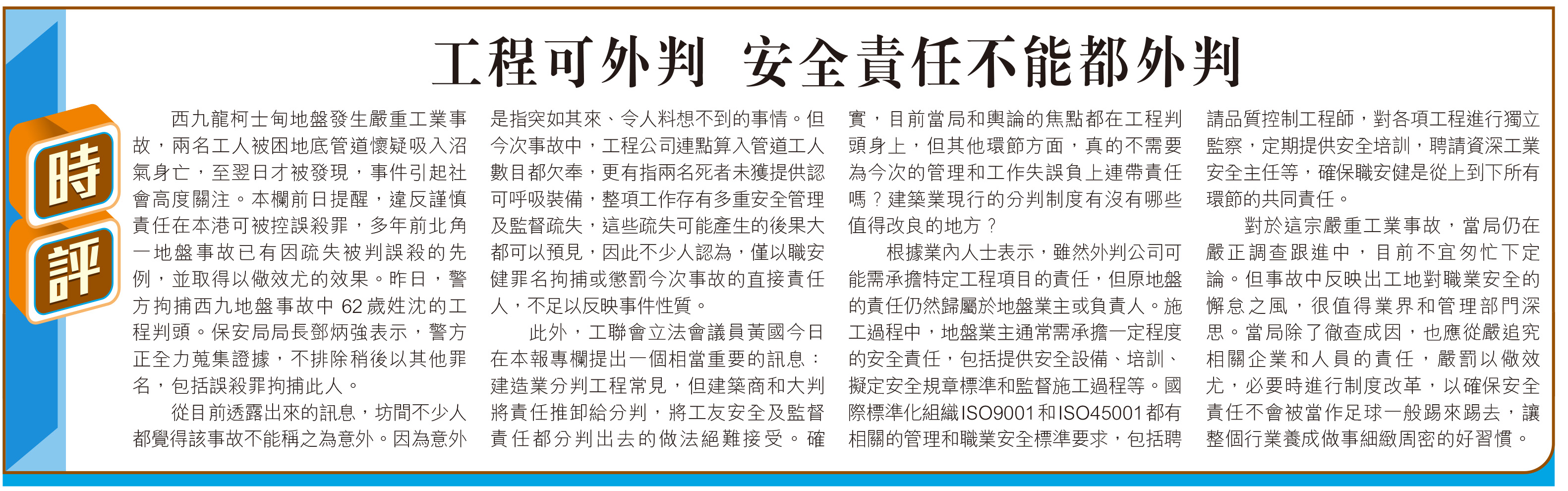 對於這宗嚴重工業事故,當局仍在嚴正調查跟進中,目前不宜匆忙下定論。但事故中反映出工地對職業安全的懈怠之風,很值得業界和管理部門深思。當局除了徹查成因,也應從嚴追究相關企業和人員的責任,嚴罰以儆效尤,必要時進行制度改革,以確保安全責任不會被當作足球一般踢來踢去,讓整個行業養成做事細緻周密的好習慣。