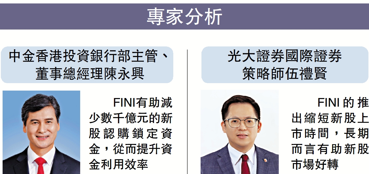 FINI的推出將改善資本市場營運效率。中金香港投資銀行部主管、董事總經理陳永興表示,FINI改變了現有的預付模式,可降低公開認購部分的預付金額,對於保薦人或投資者而言,有助降低資金成本,特別是在超額認購新股時間安排上,可減少數千億元的鎖定資金,從而提升資金利用效率。