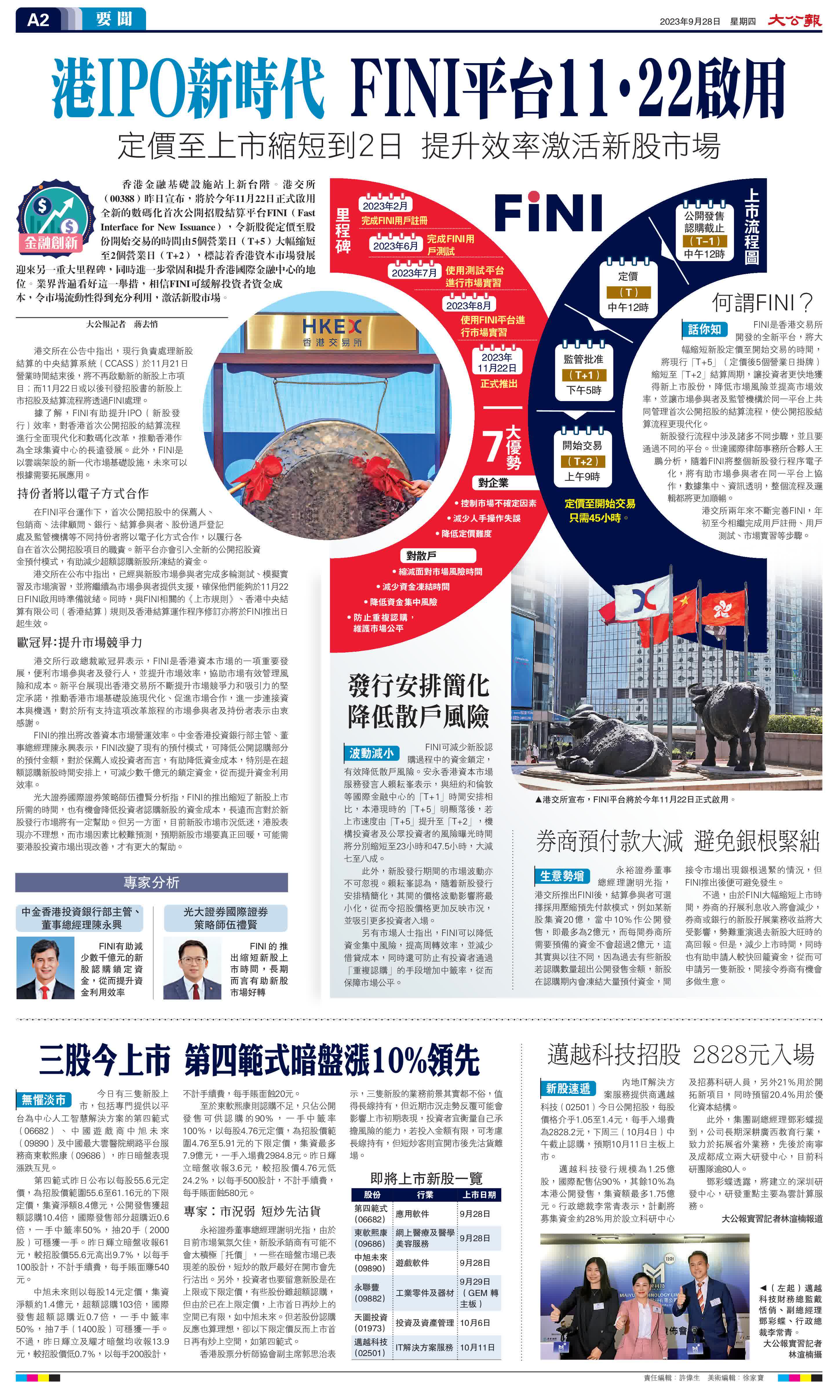 (大公報記者 蔣去悄)香港金融基礎設施站上新台階。港交所(00388)昨日宣布,將於今年11月22日正式啟用全新的數碼化首次公開招股結算平台FINI(Fast Interface for New Issuance),令新股從定價至股份開始交易的時間由5個營業日(T+5)大幅縮短至2個營業日(T+2),標誌着香港資本市場發展迎來另一重大里程碑,同時進一步鞏固和提升香港國際金融中心的地位。業界普遍看好這一舉措,相信FINI可緩解投資者資金成本,令市場流動性得到充分利用,激活新股市場。