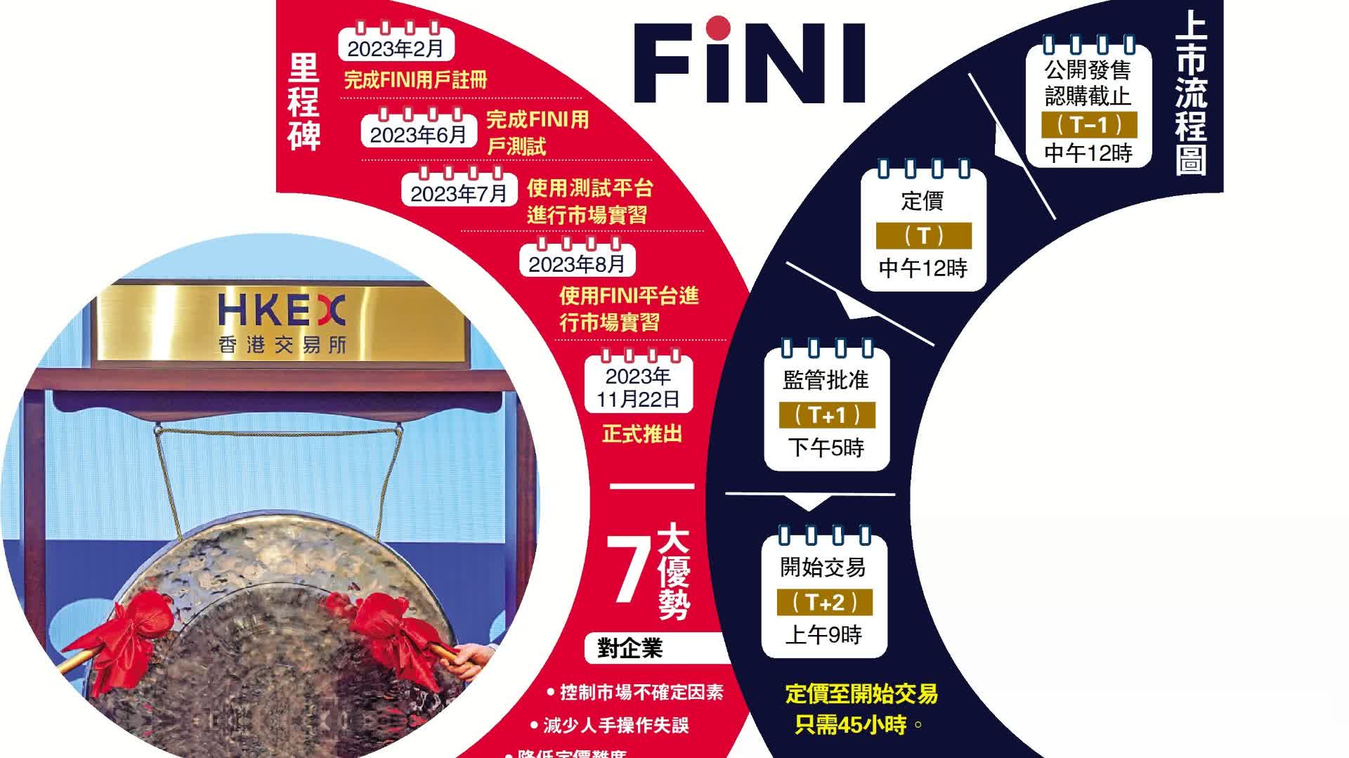 FINI是香港交易所開發的全新平台,將大幅縮短新股定價至開始交易的時間,將現行「T+5」(定價後5個營業日掛牌)縮短至「T+2」結算周期,讓投資者更快地獲得新上市股份,降低市場風險並提高市場效率,並讓市場參與者及監管機構於同一平台上共同管理首次公開招股的結算流程,使公開招股結算流程更現代化。