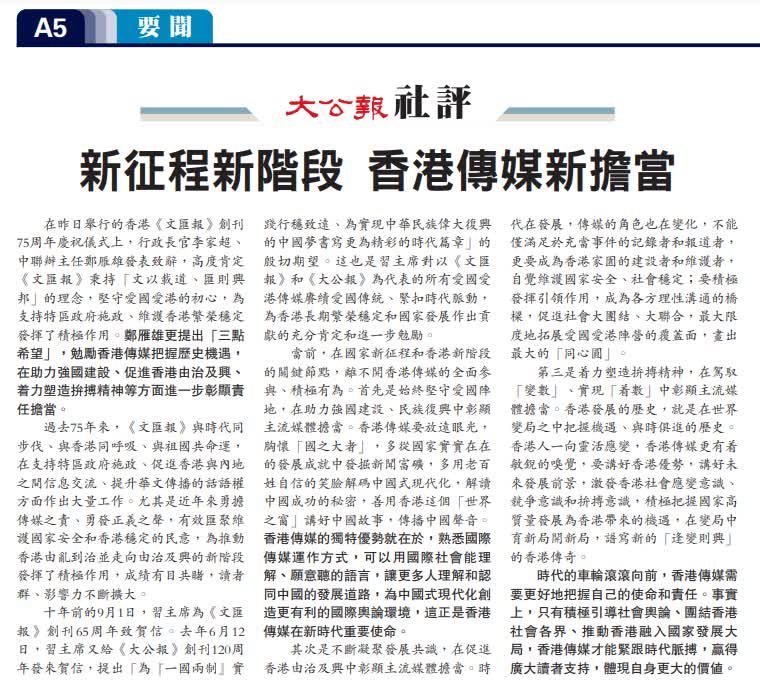 在昨日舉行的香港《文匯報》創刊75周年慶祝儀式上,行政長官李家超、中聯辦主任鄭雁雄發表致辭,高度肯定《文匯報》秉持「文以載道、匯則興邦」的理念,堅守愛國愛港的初心,為支持特區政府施政、維護香港繁榮穩定發揮了積極作用。鄭雁雄更提出「三點希望」,勉勵香港傳媒把握歷史機遇,在助力強國建設、促進香港由治及興、着力塑造拚搏精神等方面進一步彰顯責任擔當。