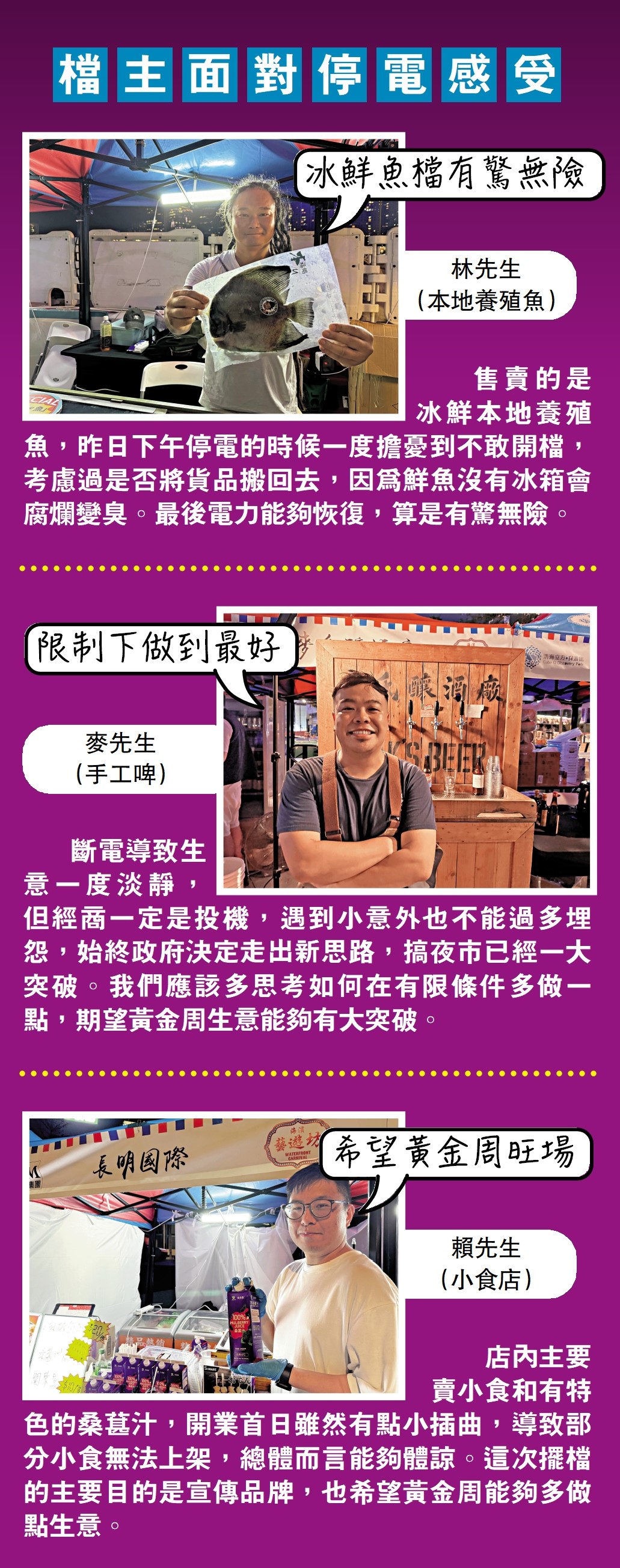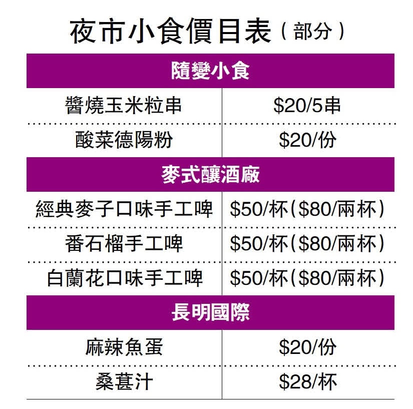 營運手工啤酒的檔戶麥先生說,手工啤一定要用機器即場炮製,若沒有冷凍裝置,炎炎夏日下室溫啤酒毫不吸引,他只好跟隔鄰有保溫箱的檔戶借冰,勉強營業,兩小時內賣出不到10杯啤酒,但他認為商戶不能太多抱怨,「始終這個場地以往不是搞大型活動,政府這次搞夜市,是突破的新思維,首日的一點錯漏,能夠體諒,檔戶也應該主動多想方法解決問題。」晚上大約8時,電力恢復正常,全場一同歡呼,「我們有啤酒賣啦!」麥先生高呼,檔攤隨即大排長龍。
