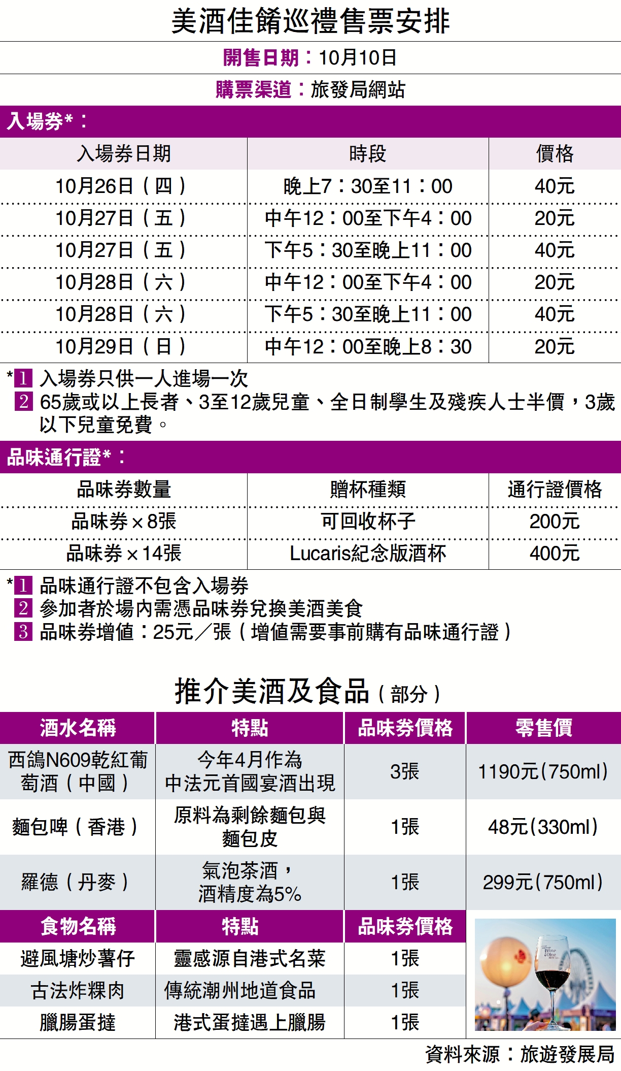 闊別五年的「美酒佳餚巡禮」將於10月26日至29日重返中環海濱,並首次引入中國、泰國葡萄酒的類別,包括「國宴」級的「蛇龍珠」。旅遊發展局預計,四日活動期間將有約14萬人次入場。近日有夜市售賣的小食被質疑售價貴,旅發局表示,「美酒佳餚巡禮」的特色美食加入創意,相信與夜市的有所不同,場內消費大致在1至8張「品味券」,折算為25元至200元不等。