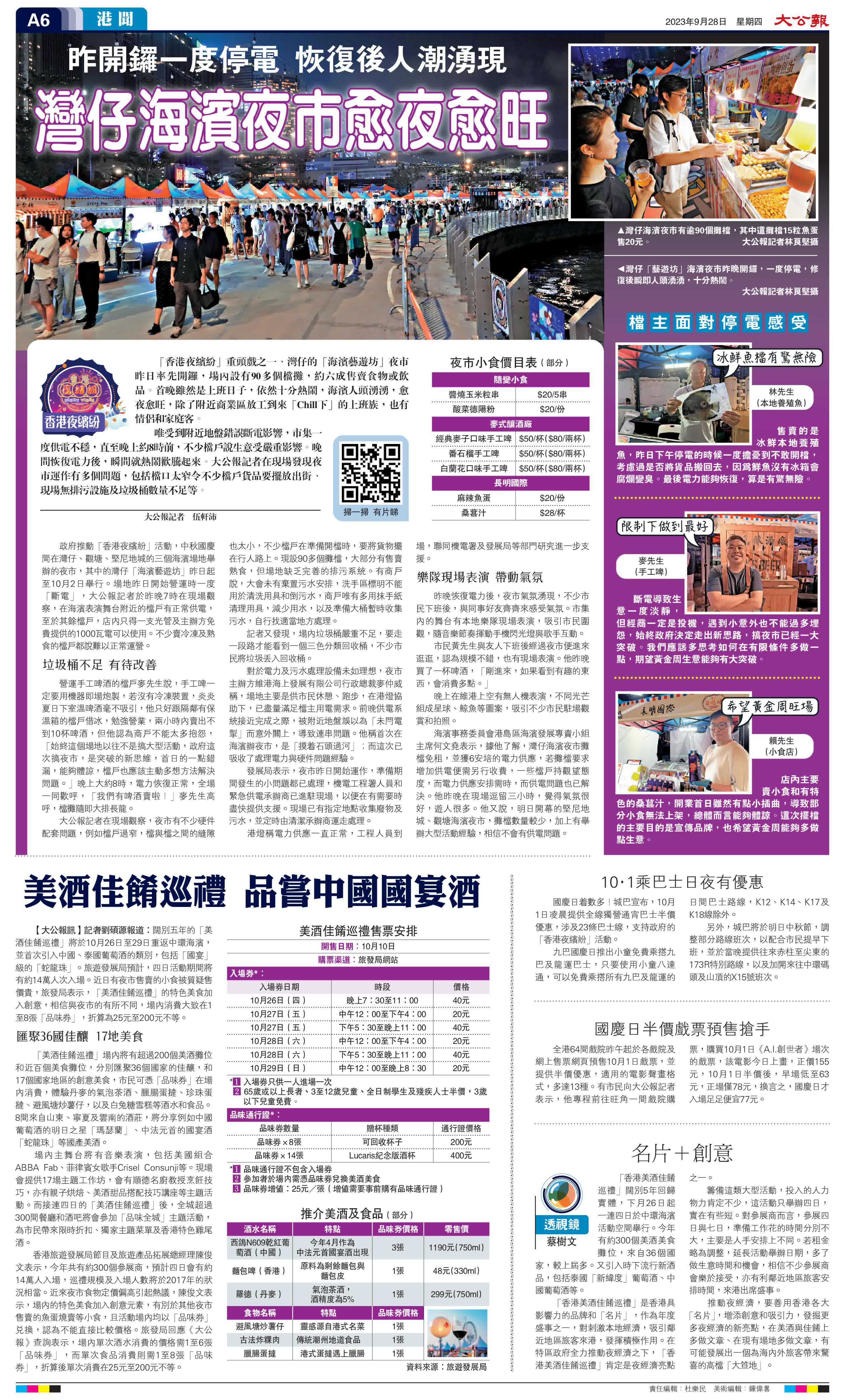 政府推動「香港夜繽紛」活動,中秋國慶間在灣仔、觀塘、堅尼地城的三個海濱場地舉辦的夜市,其中的灣仔「海濱藝遊坊」昨日起至10月2日舉行。場地昨日開始營運時一度「斷電」,大公報記者於昨晚7時在現場觀察,在海濱表演舞台附近的檔戶有正常供電,至於其餘檔戶,店內只得一支光管及主辦方免費提供的1000瓦電可以使用。不少賣冷凍及熟食的檔戶都說難以正常運營。