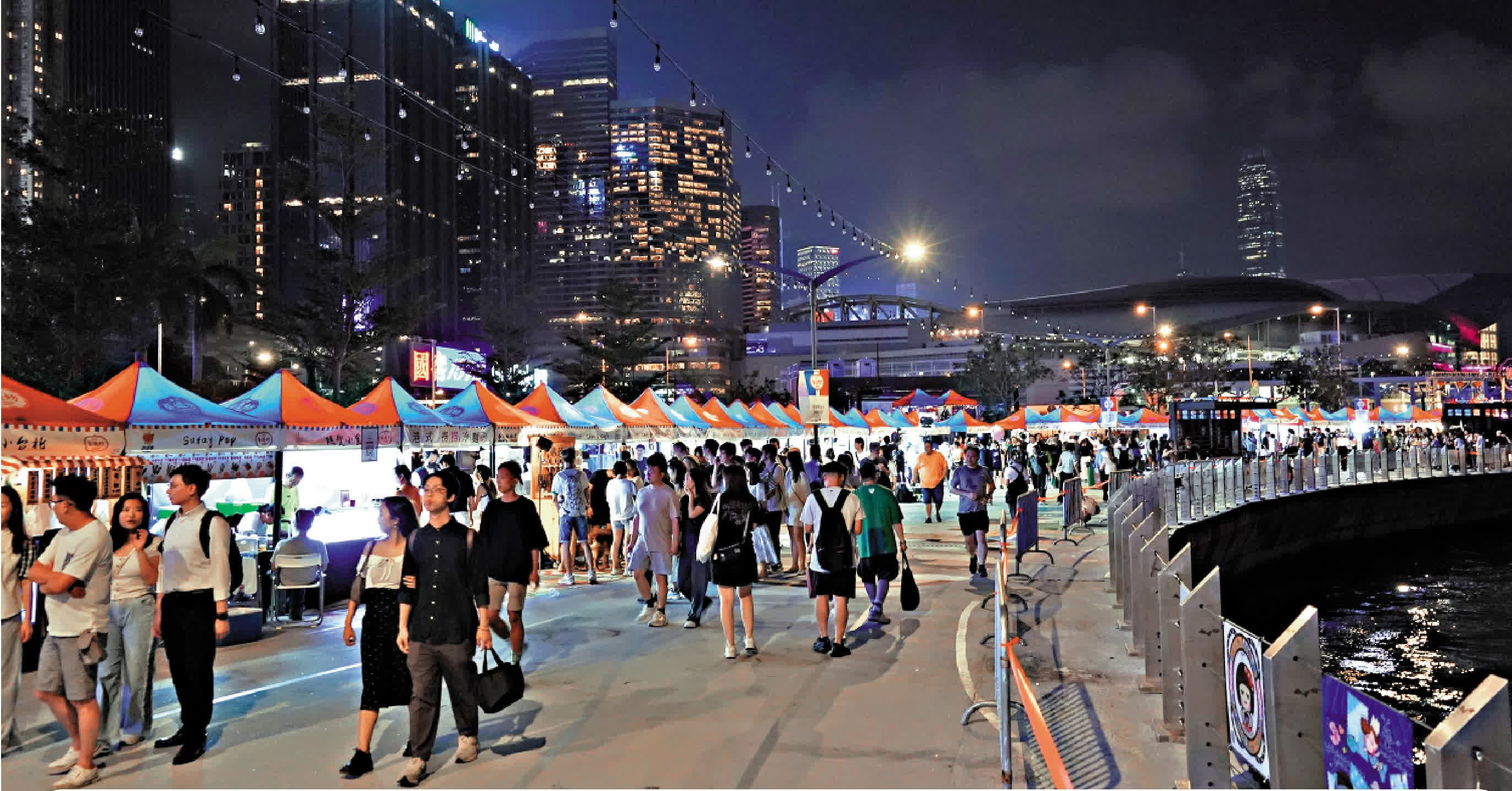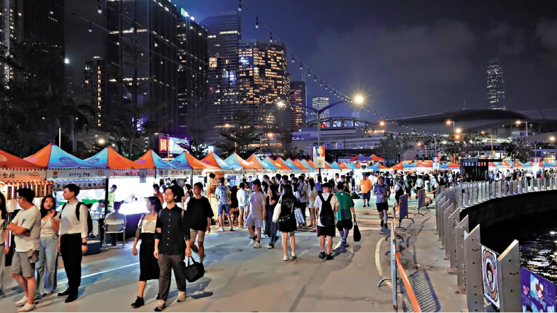 (大公報記者 伍軒沛 劉碩源)「香港夜繽紛」重頭戲之一、灣仔的「海濱藝遊坊」夜市昨日率先開鑼,場內設有90多個檔攤,約六成售賣食物或飲品。首晚雖然是上班日子,依然十分熱鬧,海濱人頭湧湧,愈夜愈旺,除了附近商業區放工到來「Chill下」的上班族,也有情侶和家庭客。