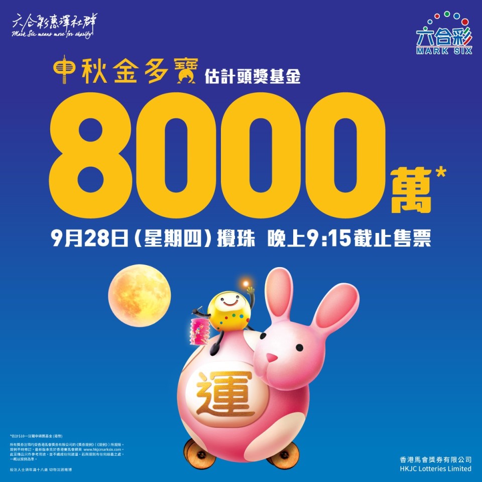 大公文匯全媒體報道,六合彩將於今晚(28日)9時30分進行中秋金多寶攪珠,由於已連續5期無人中頭獎,若今次以10元一注獨中,估計連金多寶頭獎基金可獲高達8000萬元。截止售票時間為今晚9時15分。