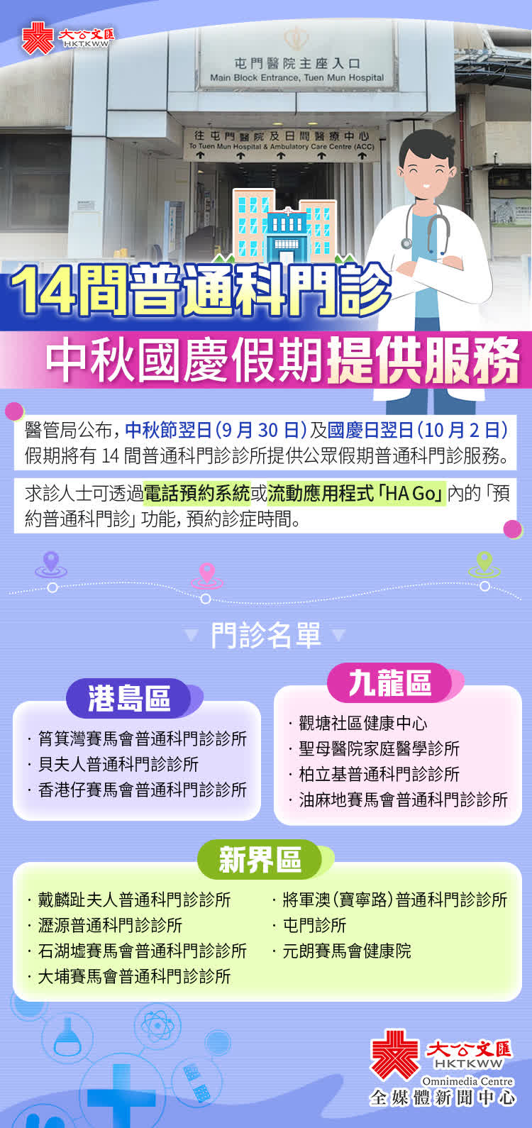 大公文匯全媒體報道,中秋國慶雙節將至,醫管局今日(28日)公布,中秋節翌日(9月30日)及國慶日翌日(10月2日)假期將有14間普通科門診診所提供公眾假期普通科門診服務。求診人士可透過電話預約系統或流動應用程式「HA Go」內的「預約普通科門診」功能,預約診症時間。