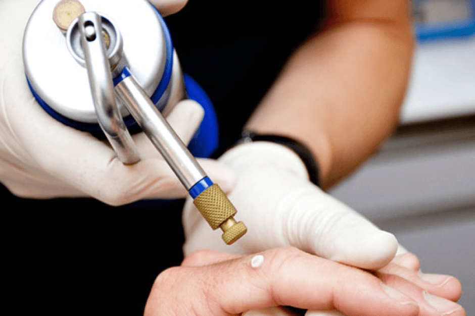 冷凍脫疣治療是一種常見的物理性脫疣療法。冷凍脫疣會利用高達攝氏負196度的液態氮,當液態氮到達皮膚表面時,溫度大約是攝氏負20-50度。經過冷凍和回溫的循環,面上的疣會被凍傷,然而疣的細胞會壞死而脫落。
