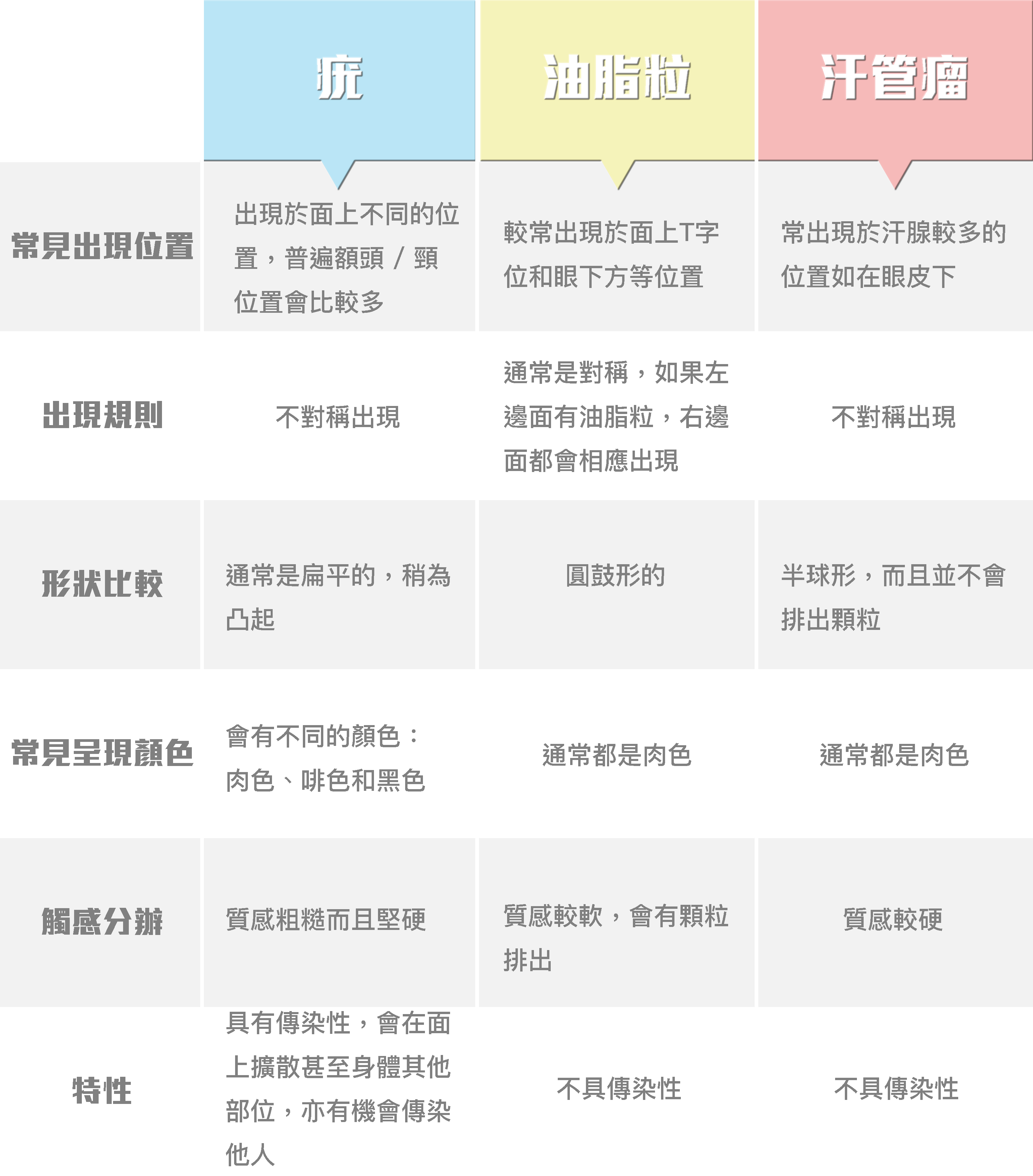 疣的形狀像顆粒,表面可以是平滑(扁平疣),亦可能略帶粗糙(普通疣),因此,並非所有臉上「粒粒」都是疣。在日常生活中比較容易被人混淆為「疣」的就包括油脂粒和汗管瘤,以下為簡單分辨方法: