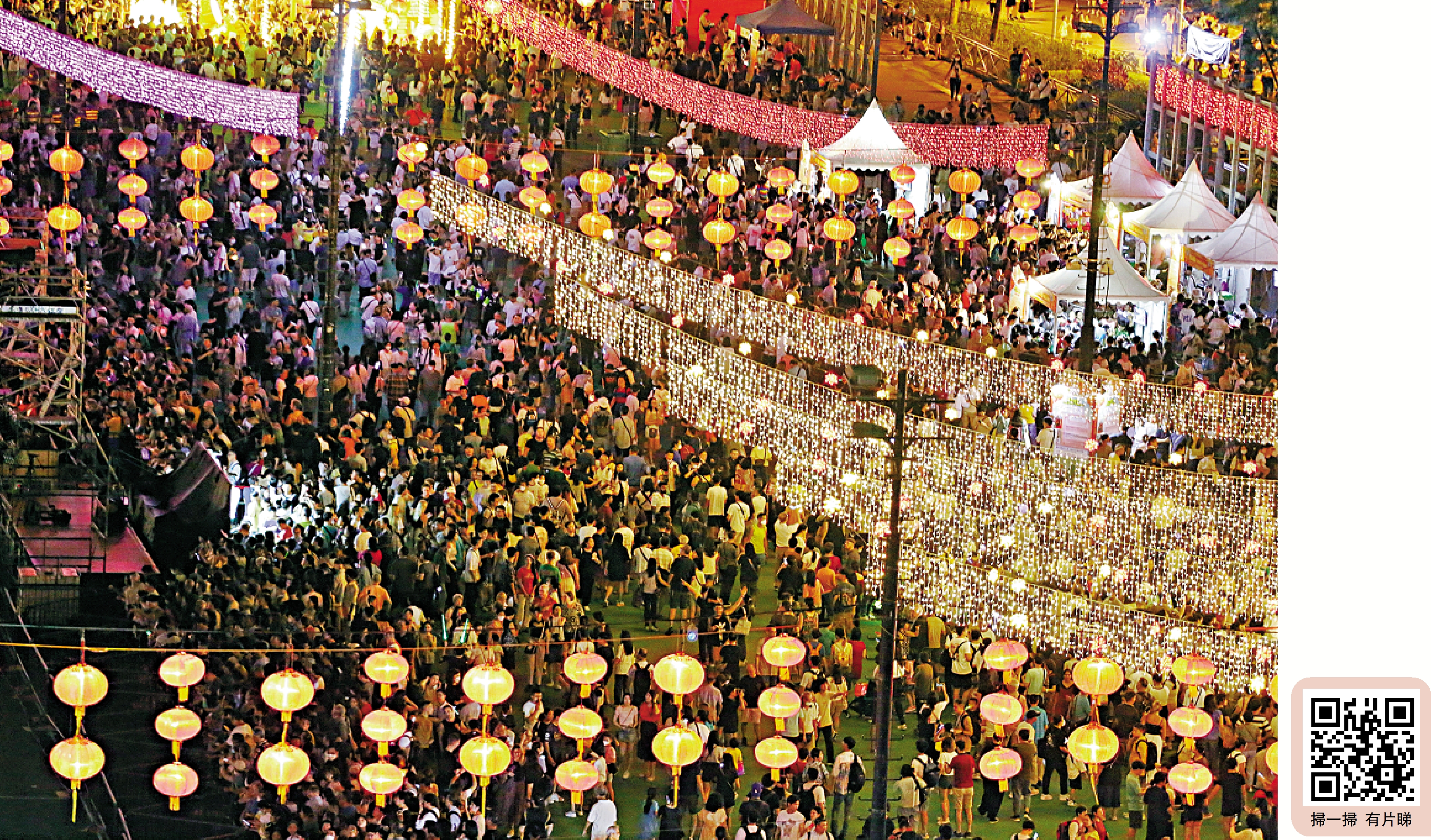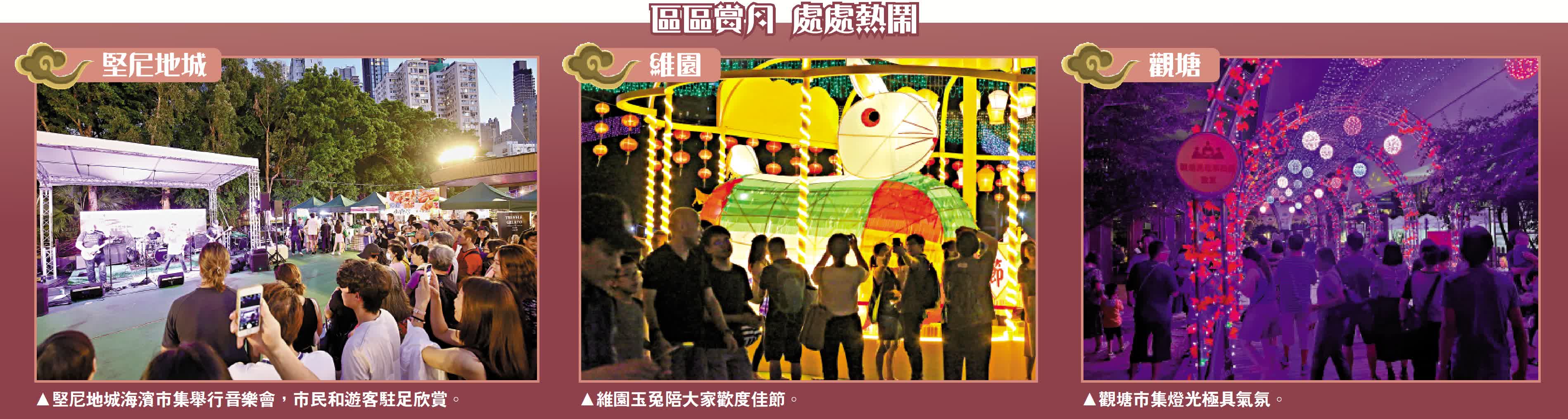 在維園的綵燈會,傍晚時分已經吸引大批市民到來觀賞花燈、猜燈謎。大型綵燈各有主題,熊貓、玉兔等綵燈更是市民最愛的打卡點,不少家長與子女來感受節日氣氛。市民黎先生說,中秋節是中國的傳統團聚節日,所以不打算外遊,三代同堂留港享受團聚樂趣才有味道。他認為「香港夜繽紛」一連串活動,令他最近對晚上出街消費的意欲大增,「如果能夠一直都搞得旺,像這兩晚這樣就好了。」