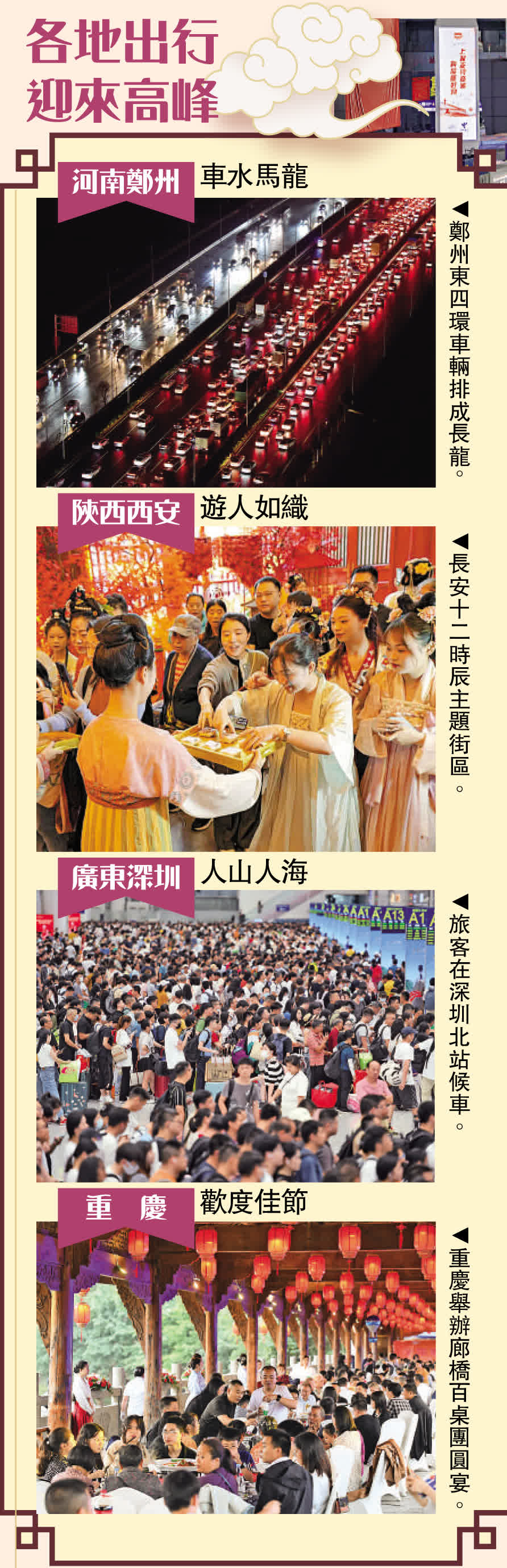 (大公報 記者 石華、方俊明、李陽波)9月29日,為期8天的中秋國慶「超級黃金周」迎來「火爆」開場,全國迎來探親、旅遊出行高峰,中國鐵路、公路、水路、民航預計發送旅客總量6320.5萬人次,環比增長20.1%,比2022年同期增長53.2%。從9月28日下午起,不少城市提前開啟擁堵模式,各地火車站、高速路目前已出現「人從眾」模式;廣東多條高速路段車龍處處,「堵車」「高速」等話題登上多個社交媒體熱搜。更有出行旅客直言,「開了10個小時車還沒出廣東」,駕車出行人士為「避堵」各出奇謀。