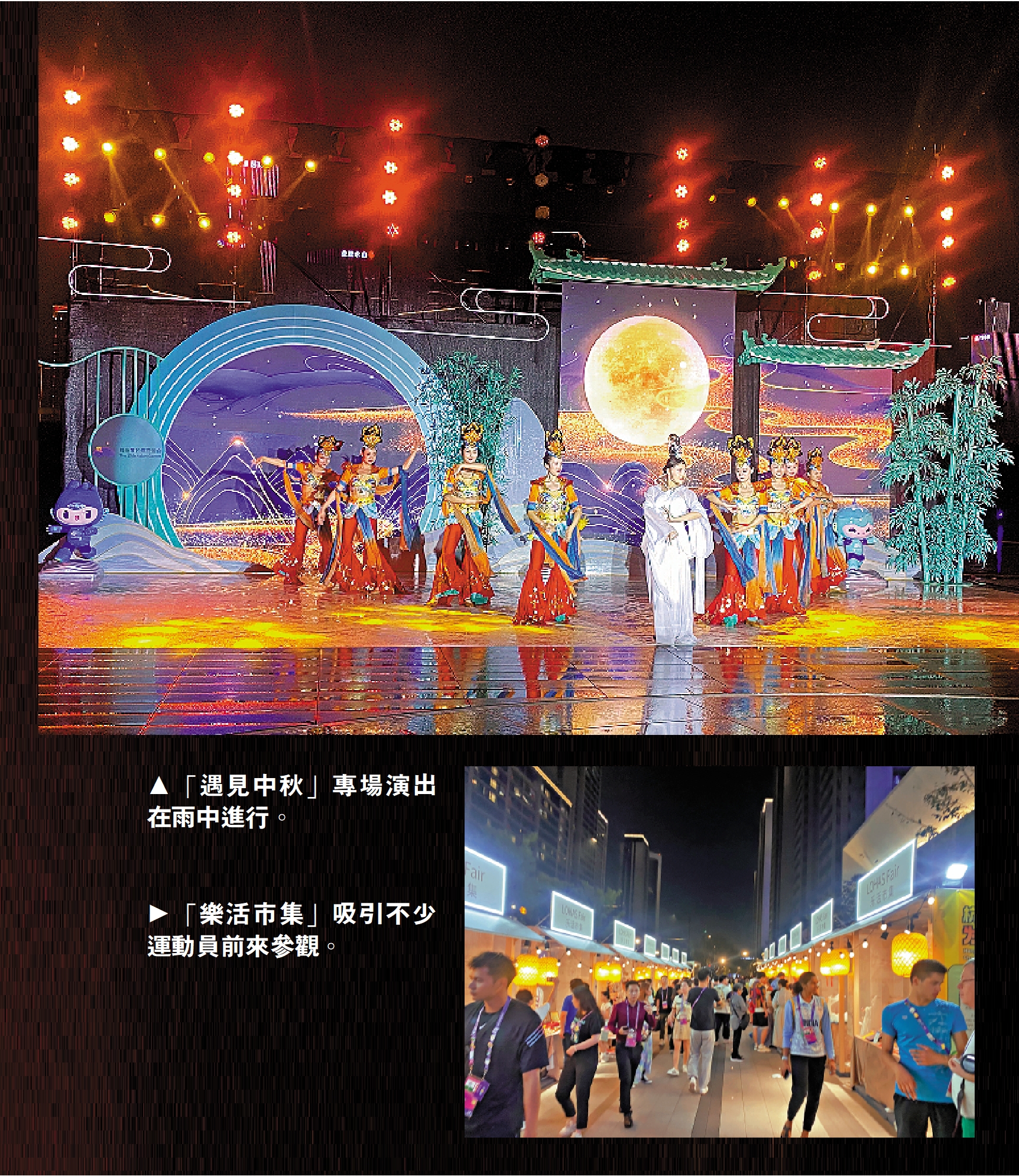 「親愛的運動員們,晚上好!Welcome to Hangzhou!」在中國傳統民樂的背景聲中,兩位主持人以中英文雙語的方式,宣布昨晚的重頭戲──「遇見中秋」專場演出開始。來自新加坡、馬來西亞、越南、泰國等國家和地區的運動員們聞聲而來,或舉起雨傘,或身着雨衣,「啪啪啪」地鼓起掌來。雖然天公不作美,原定於7點30分開場的晚會因大雨延遲了半個多小時,但提前得知演出消息的運動員們依然選擇了等待。「能那麼近距離地觀賞中國國粹,這樣的機會太難得了!」