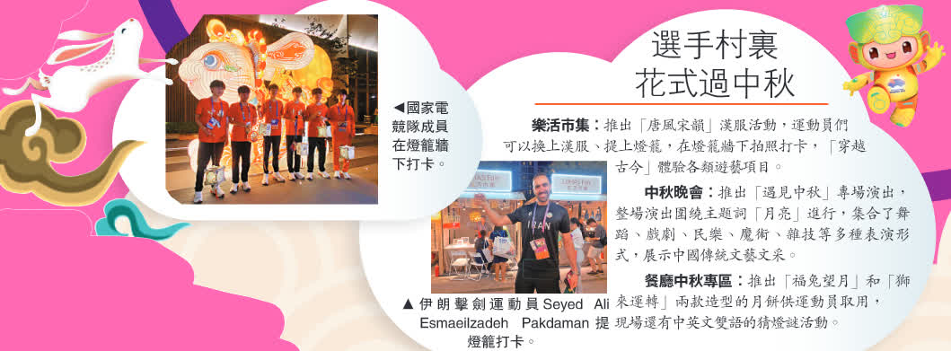 (大公報 記者 俞晝、敖敏輝)9月29日晚,明月當空,一盞5米寬,3米高的巨型玉兔花燈在杭州亞運會選手村的「樂活市集」被點亮,與皎潔的月光相映成趣,猶如一幅美好的立體畫卷。因亞運相聚杭州的各個國家和地區的運動員們紛紛換上漢服、提起燈籠,在燈籠牆下拍照打卡,「穿越古今」猜起了燈謎,玩起了投壺、練起了空竹……在這個難忘的中秋夜晚,運動員們在脫下運動裝的同時,也卸下備戰的緊張情緒,於村內共赴一場別具特色的「中式浪漫」。