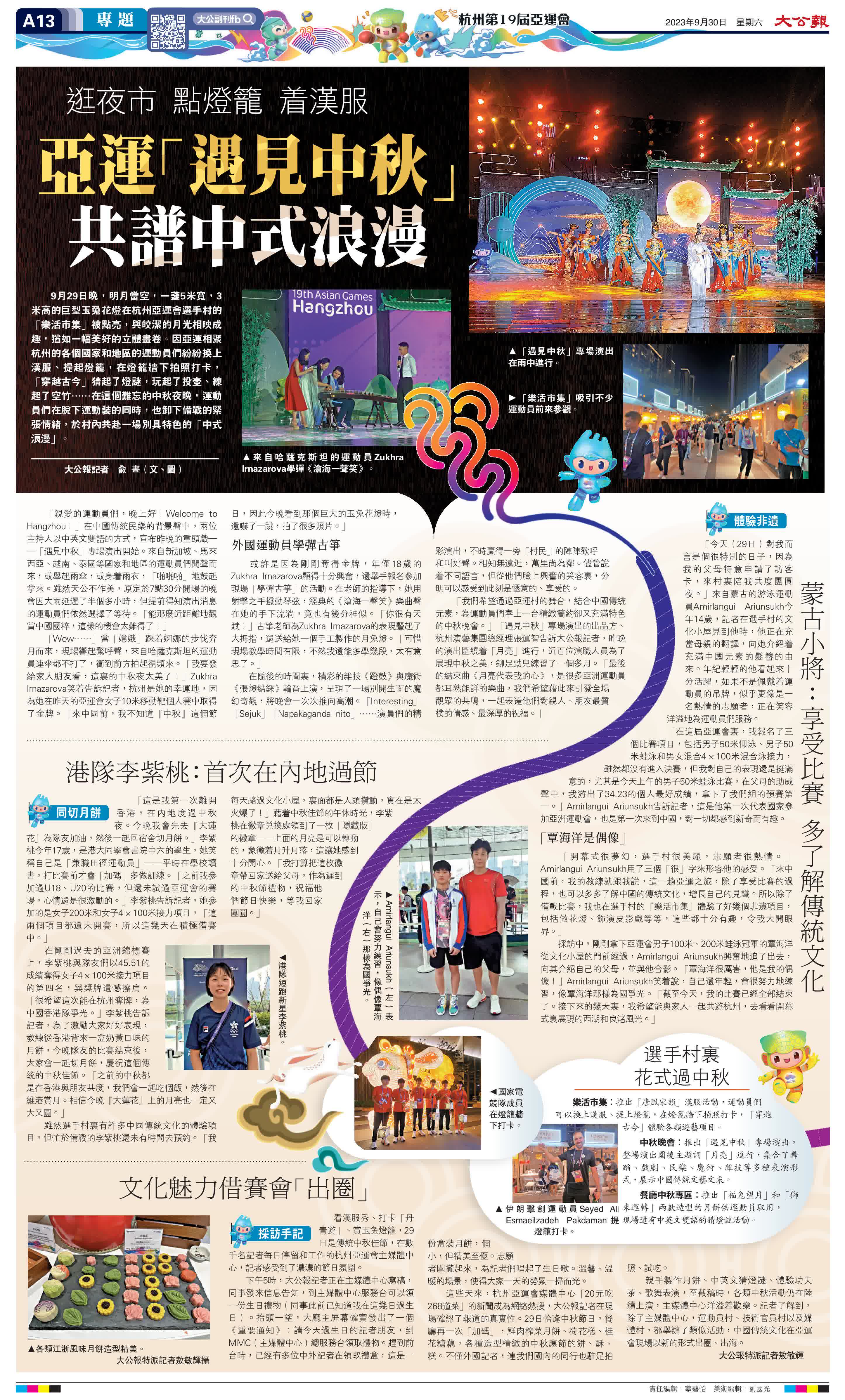 「這是我第一次離開香港,在內地度過中秋夜。今晚我會先去『大蓮花』為隊友加油,然後一起回宿舍切月餅。」李紫桃今年17歲,是港大同學會書院中六的學生,她笑稱自己是「兼職田徑運動員」——平時在學校讀書,打比賽前才會「加碼」多做訓練。「之前我參加過U18、U20的比賽,但還未試過亞運會的賽場,心情還是很激動的。」李紫桃告訴記者,她參加的是女子200米和女子4×100米接力項目,「這兩個項目都還未開賽,所以這幾天在積極備賽中。」