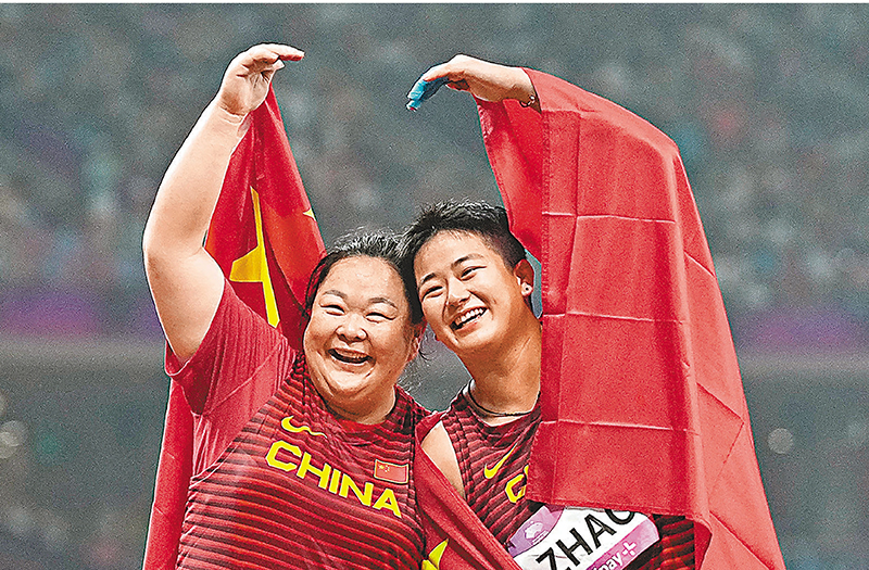 在首先舉行的女子鏈球決賽中,中國隊派出第四次出戰亞運的王崢以及小將趙傑作「雙保險」,結果之前3屆亞運均得銀牌的王崢,在最後一投投出71米53,首度奪得亞運金牌,亦幫助中國田徑隊實現此項目亞運6連冠;趙傑則以69米44成績取得銀牌。